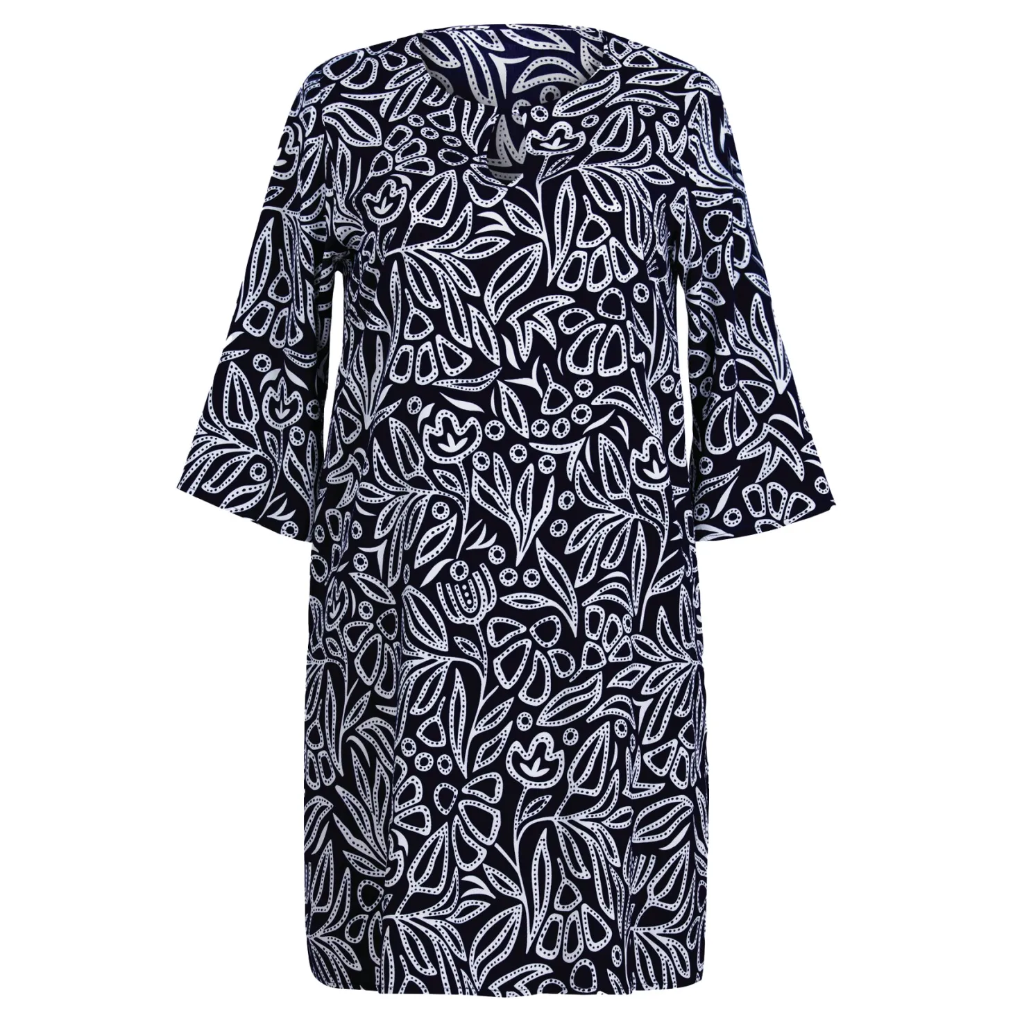 - Design: This dress features a bold navy-and-white abstract floral print with a relaxed silhouette, three-quarter sleeves, and a subtle keyhole neckline for added interest.