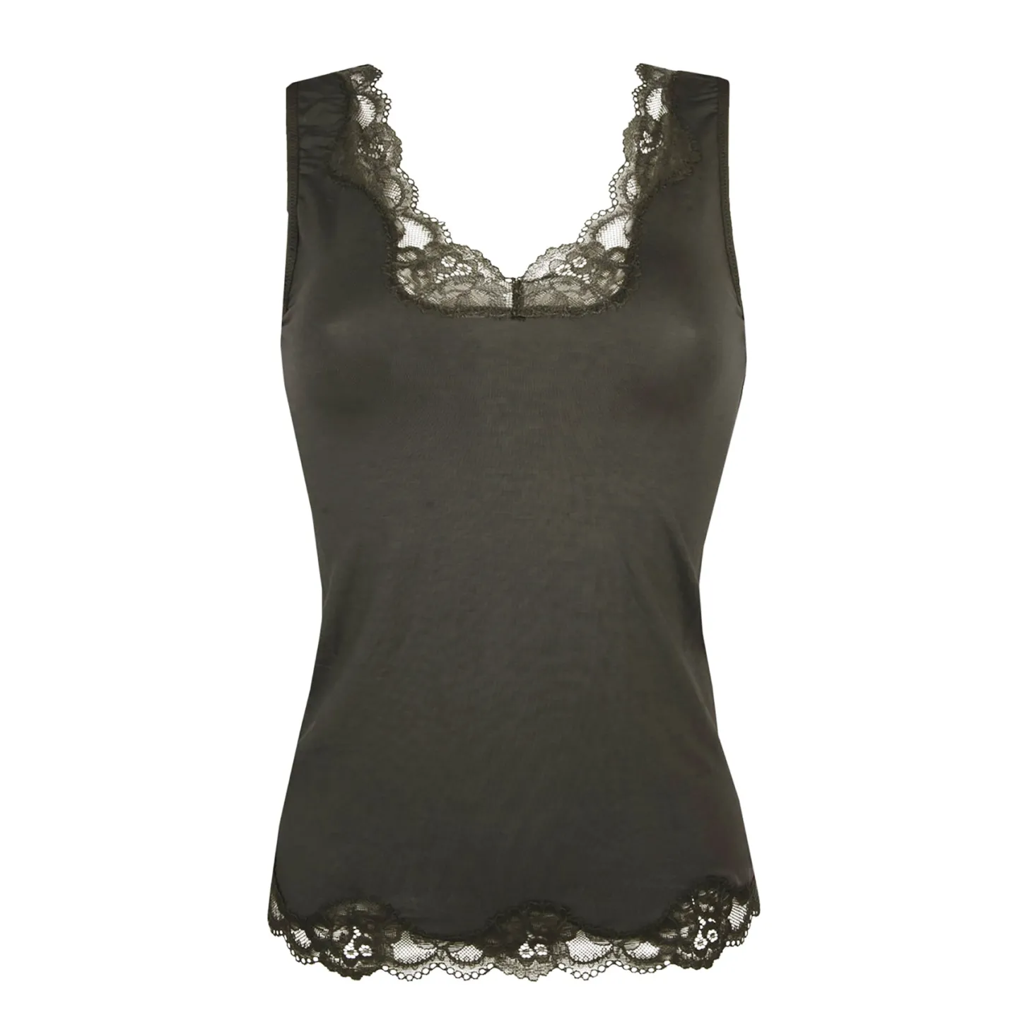 Sleek, soft, and effortlessly refined – the Antigel Simply Perfect V-Neck Tank in Éclat Aventure is a layering essential with feminine flair. Crafted from ultra-soft stretch fabric, it features delicate floral lace trim along the neckline and hem for an elegant finish. The fitted silhouette hugs your shape, making it perfect for wearing alone or under your favourite knits and jackets. A chic staple in deep olive green for every season.