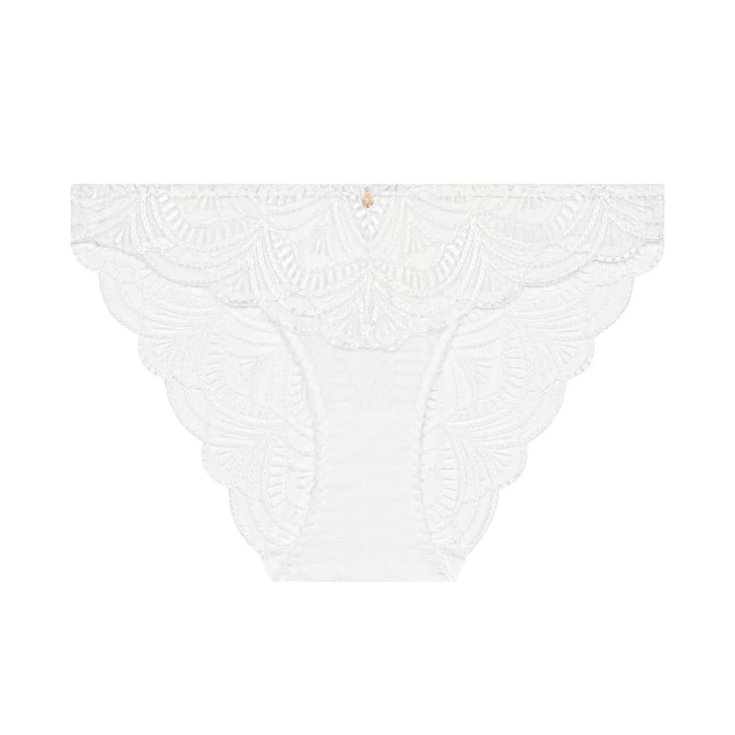- Design: This brief features sheer tulle with bold fan-inspired embroidery, finished with a soft waistband and a delicate gold charm at the center for a touch of glamour.