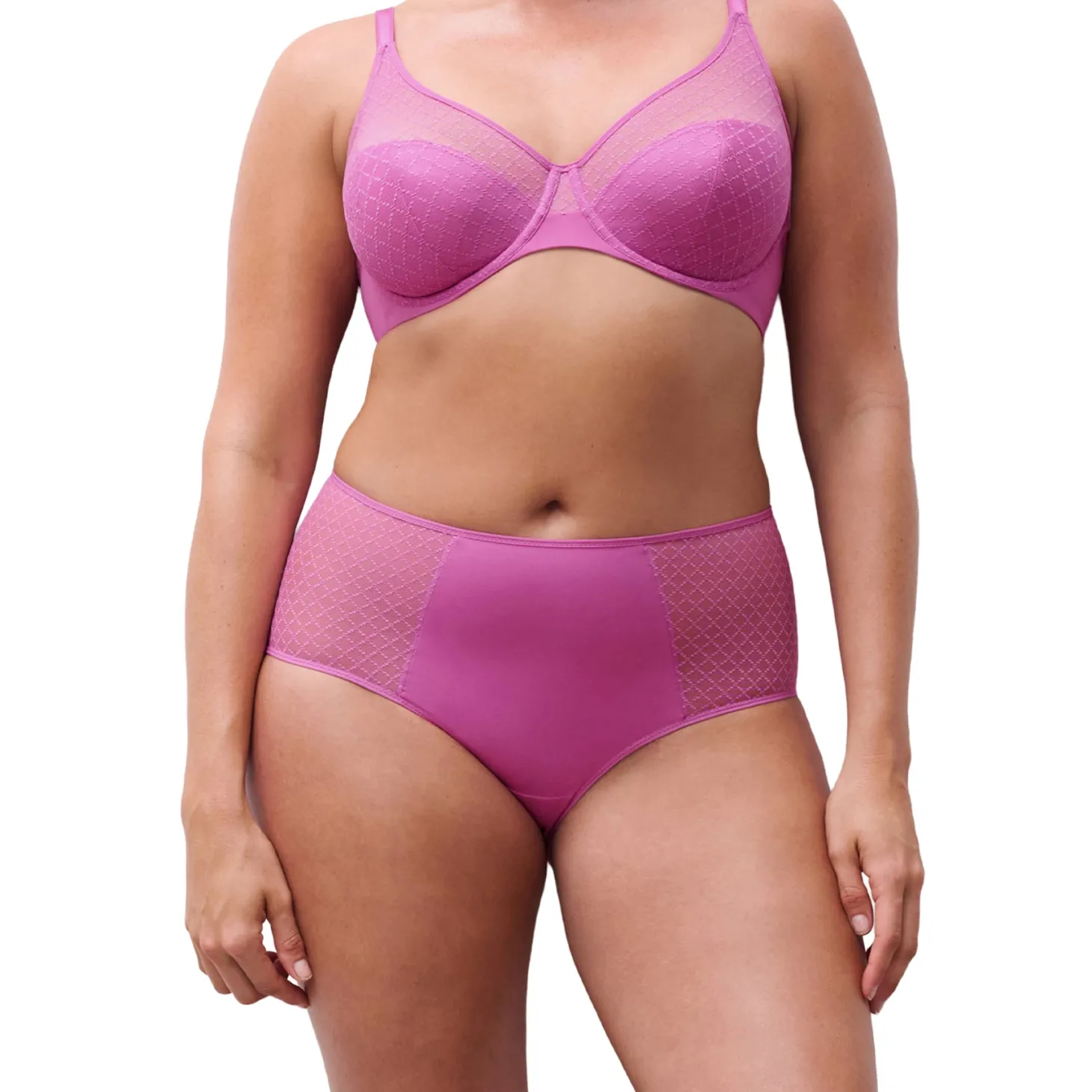 - Design: A high-rise full brief with a smooth front panel and sheer mesh side inserts featuring a refined geometric pattern.