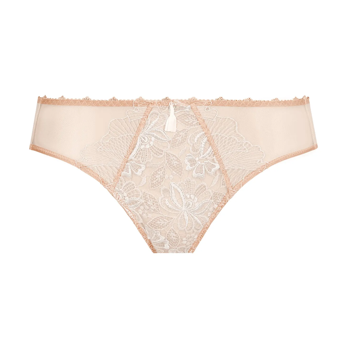 - Design: Embroidered tulle bikini brief with a classic cut. Stretchy tulle at back. Small ring embellished with ribbon at waist. Gusset lined with 100% Cotton.