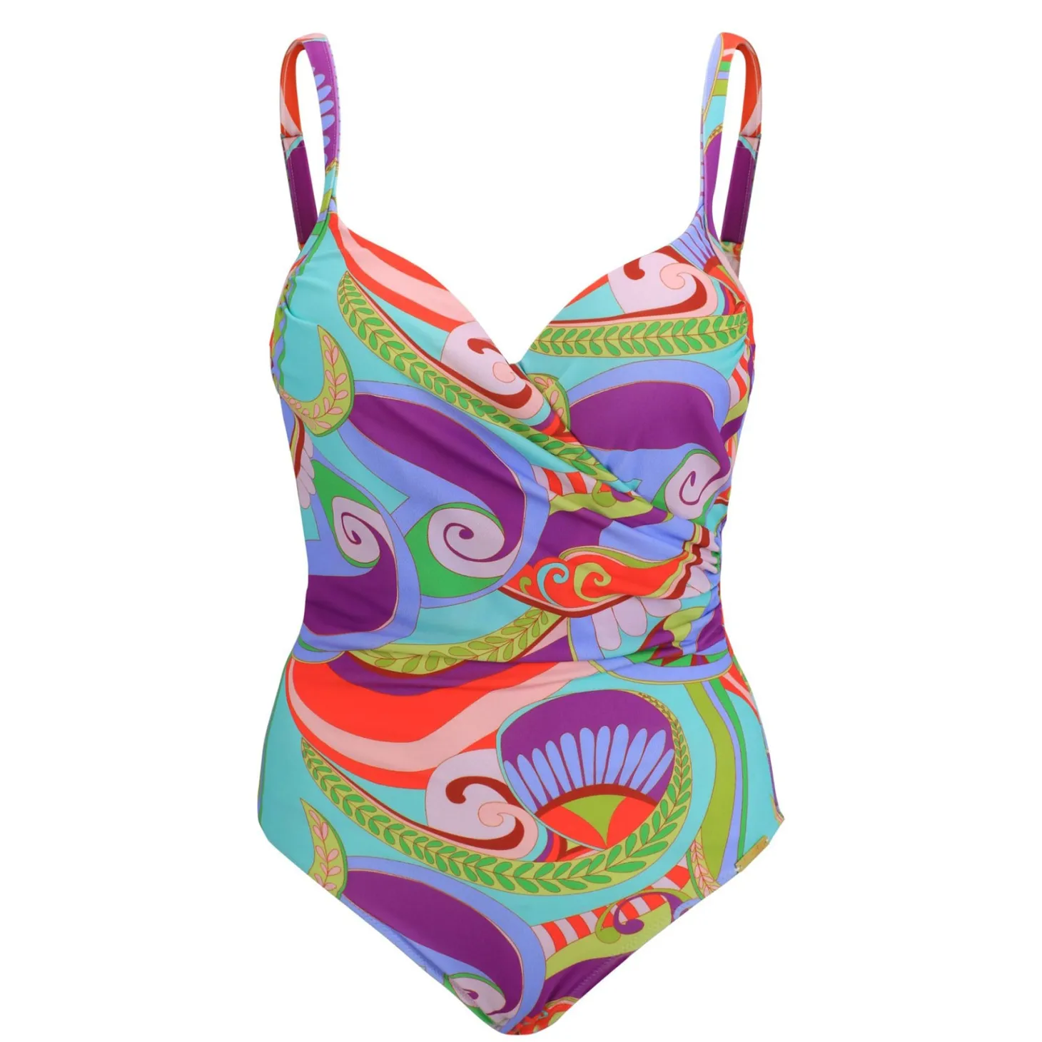 This one-piece swimsuit brings bold energy to the water with its swirling multicolour pattern and figure-enhancing wrap-front design.