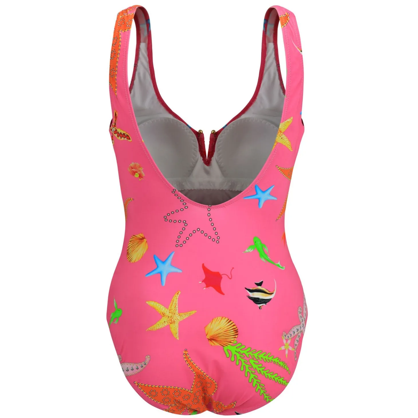 Dive into vibrant summer style with this playful one-piece swimsuit, splashed in a hot pink base and adorned with colourful starfish, tropical fish, and sea flora.