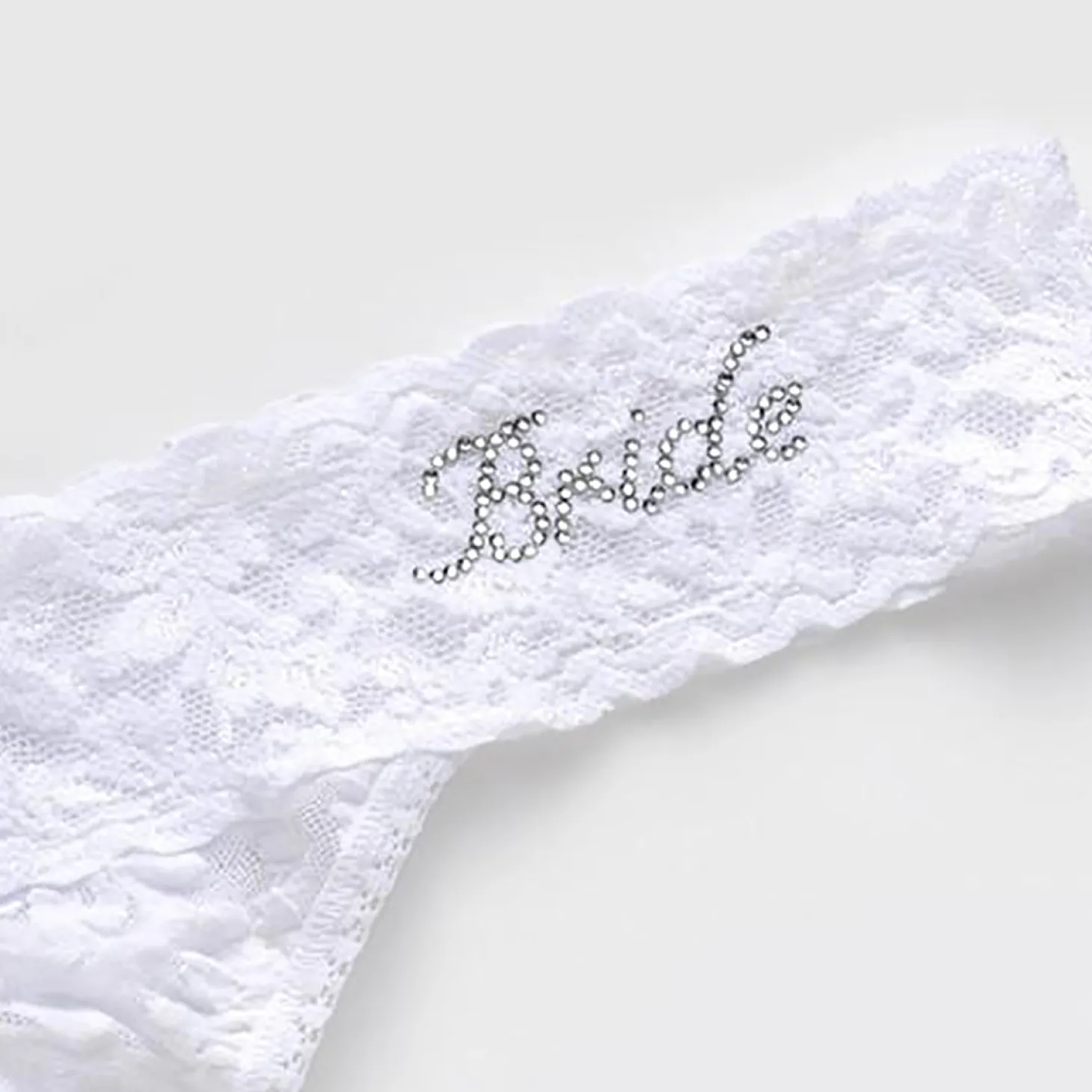 - Style: Stretch Lace Original Rise Thong w/ “Bride” Crystals