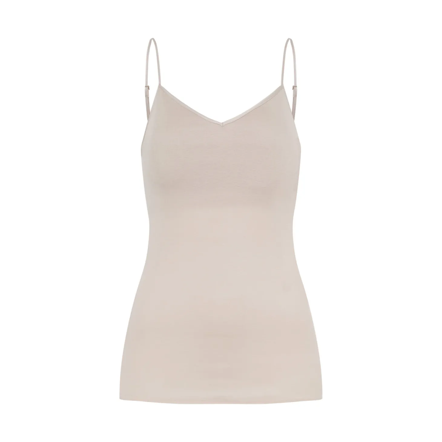 - Design: Spaghetti strap lightweight camisole with removable pads and a shelf bra for an added layer of modesty. Hemless bottom. Signature seamless sides with adjustable satin straps providing custom fit. Satin trimmed V-neckline and longer length makes it versatile enough to wear on its own.