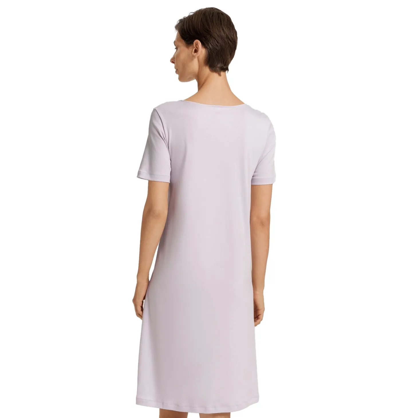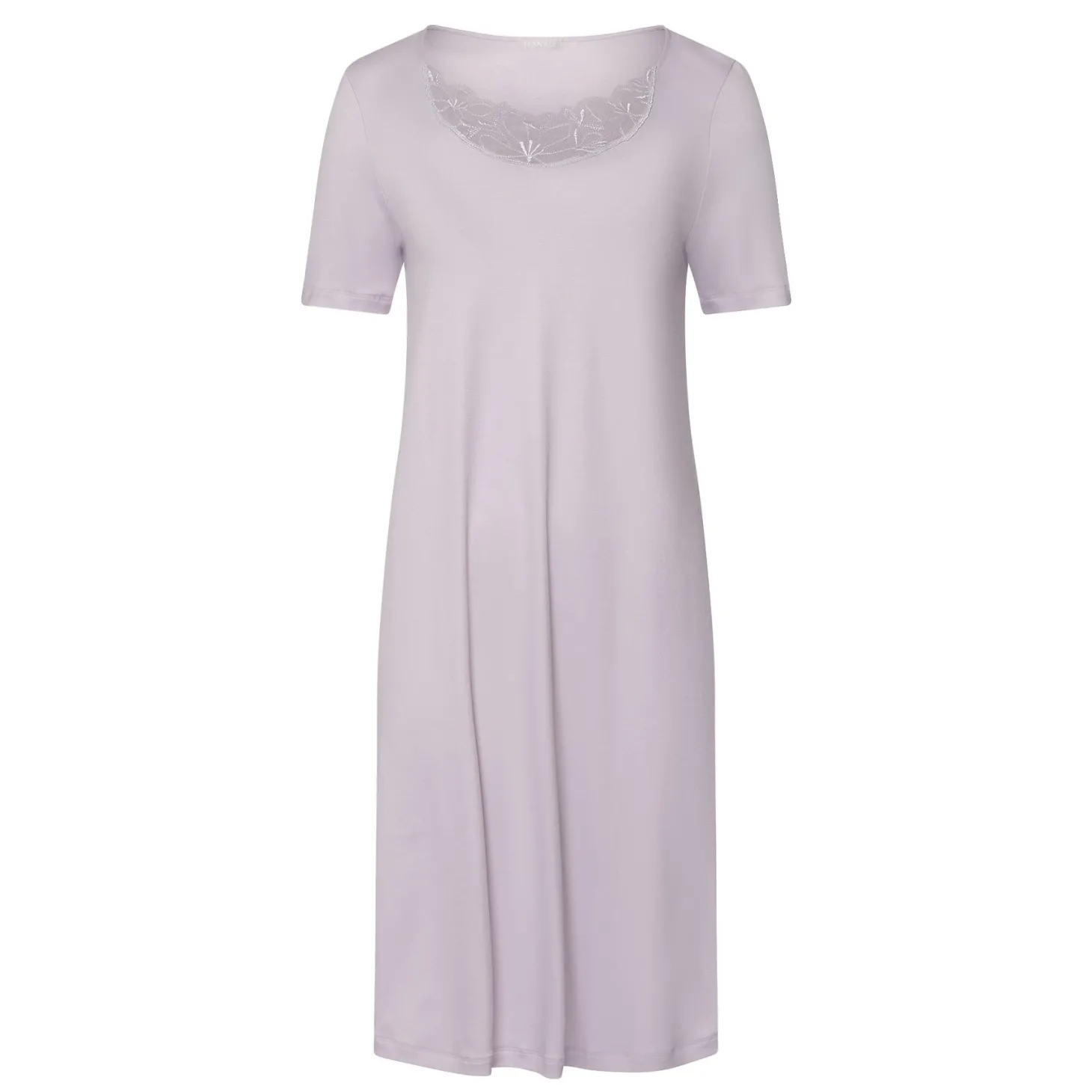 The neckline of this nightgown with short sleeves is adorned with a necklace-shaped embroidered trim made in Austria.