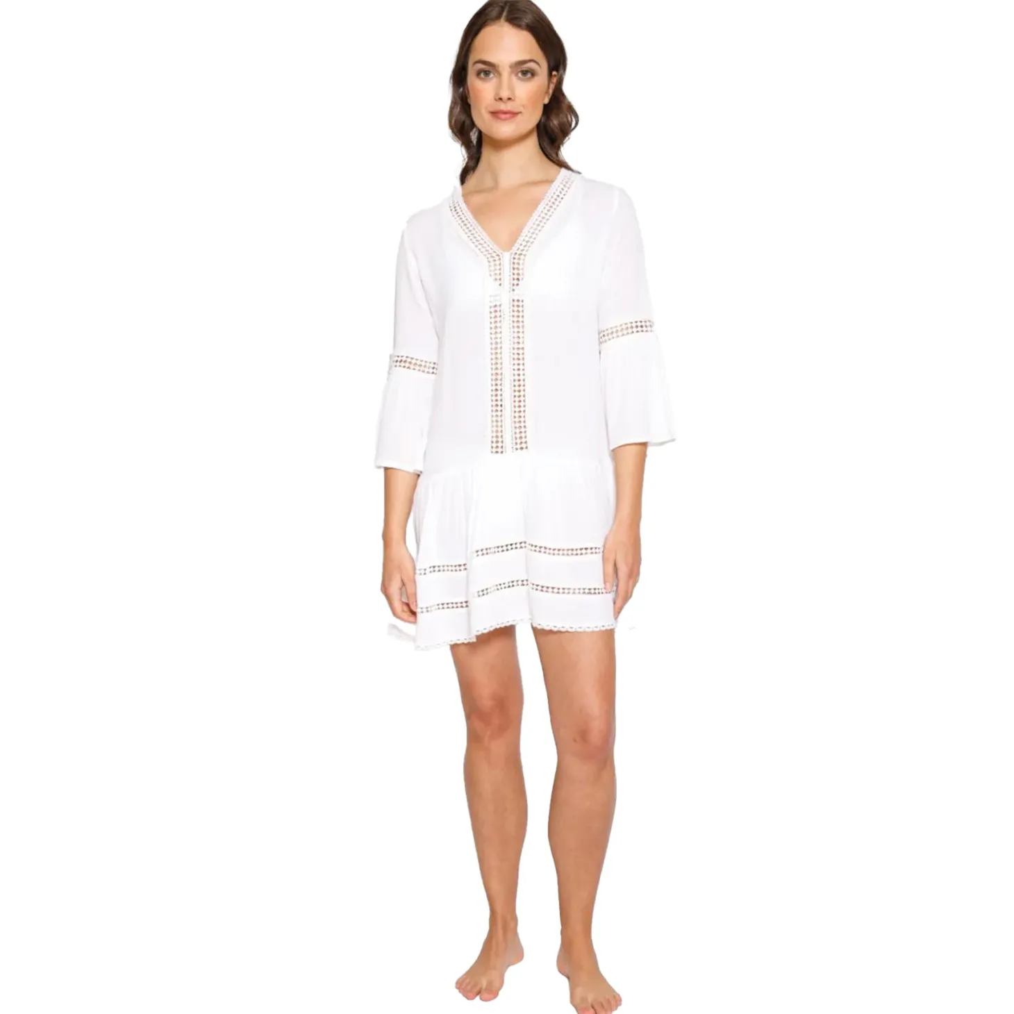 - Design: This easy, lightweight dress features a soft woven fabric with a relaxed A-line silhouette, delicate lace trim along the V-neckline, and slim adjustable straps for a customizable fit. Side pockets and gentle tiered detailing add effortless movement and everyday wearability.