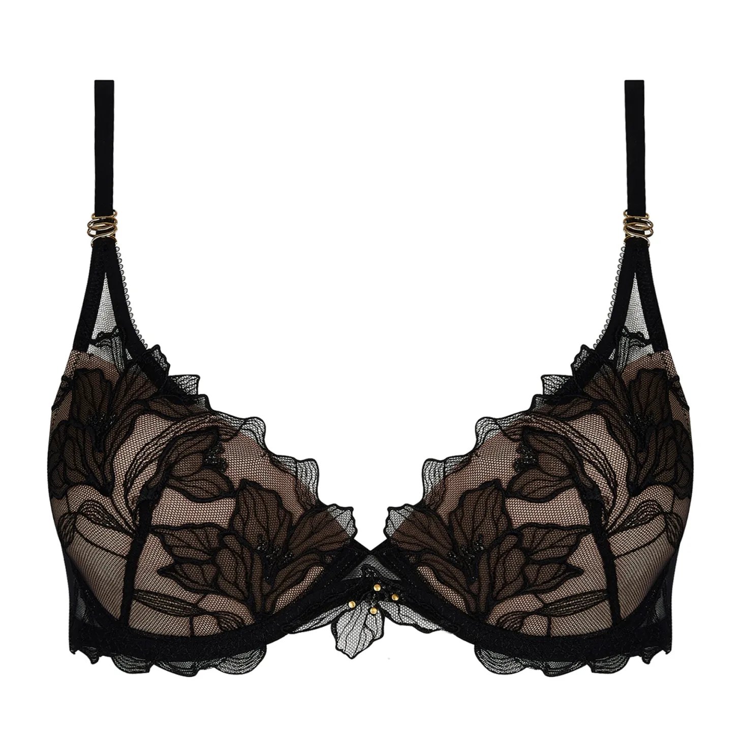 Indulge in the seductive sophistication of Lise Charmel’s Désir et Volupté collection, a masterclass in French luxury craftsmanship. This breathtaking black lingerie set pairs sheer, ultra-fine tulle with dimensional floral embroidery, creating a dramatic tattoo-effect against the skin.
