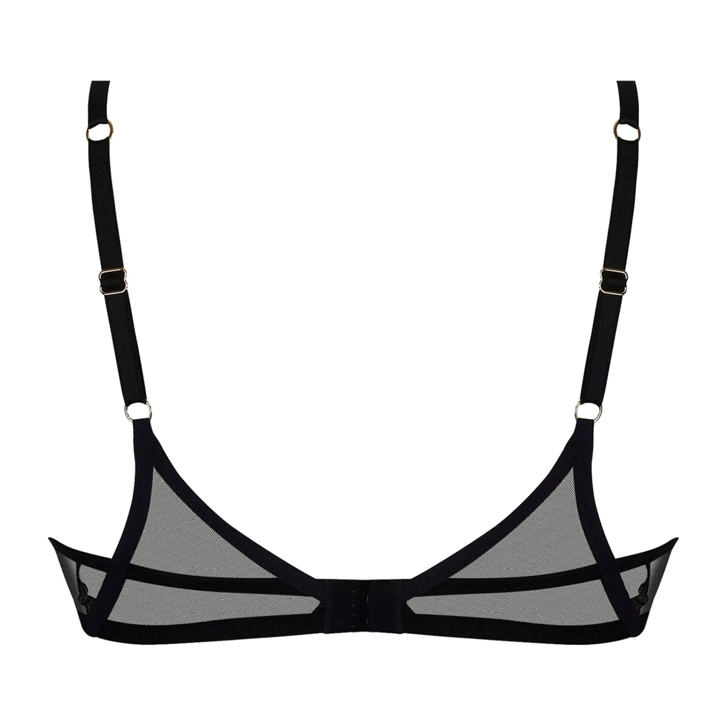 - Design: The cups feature embroidered tulle with scalloped edges, organza accents, and a refined crystalline-tulle cut-out at the base of the straps, finished with delicate picot trim. The scalloped embroidery continues along the sides and back, highlighted by sheer crystalline-tulle panels. A semi-sheer tulle center gore showcases an embroidered motif with gold cabochon accents, creating a subtle cut-out effect against the skin. A gold-tone jewel detail completes the look at the strap base.