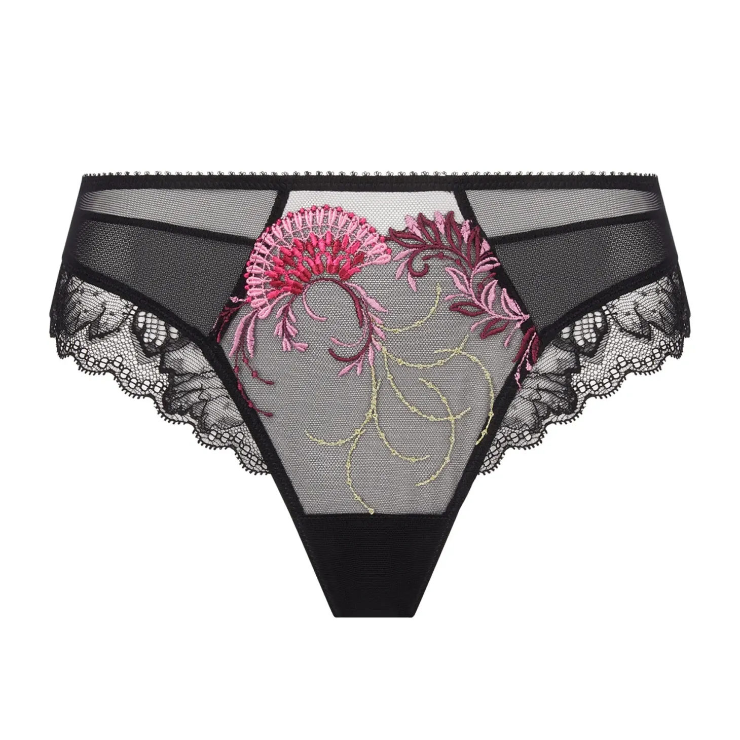 - Design: Embrace bold elegance with this black mesh Italian Panty, featuring intricate floral embroidery in vibrant pink and gold hues, complemented by delicate lace trim for a luxurious, seductive finish.