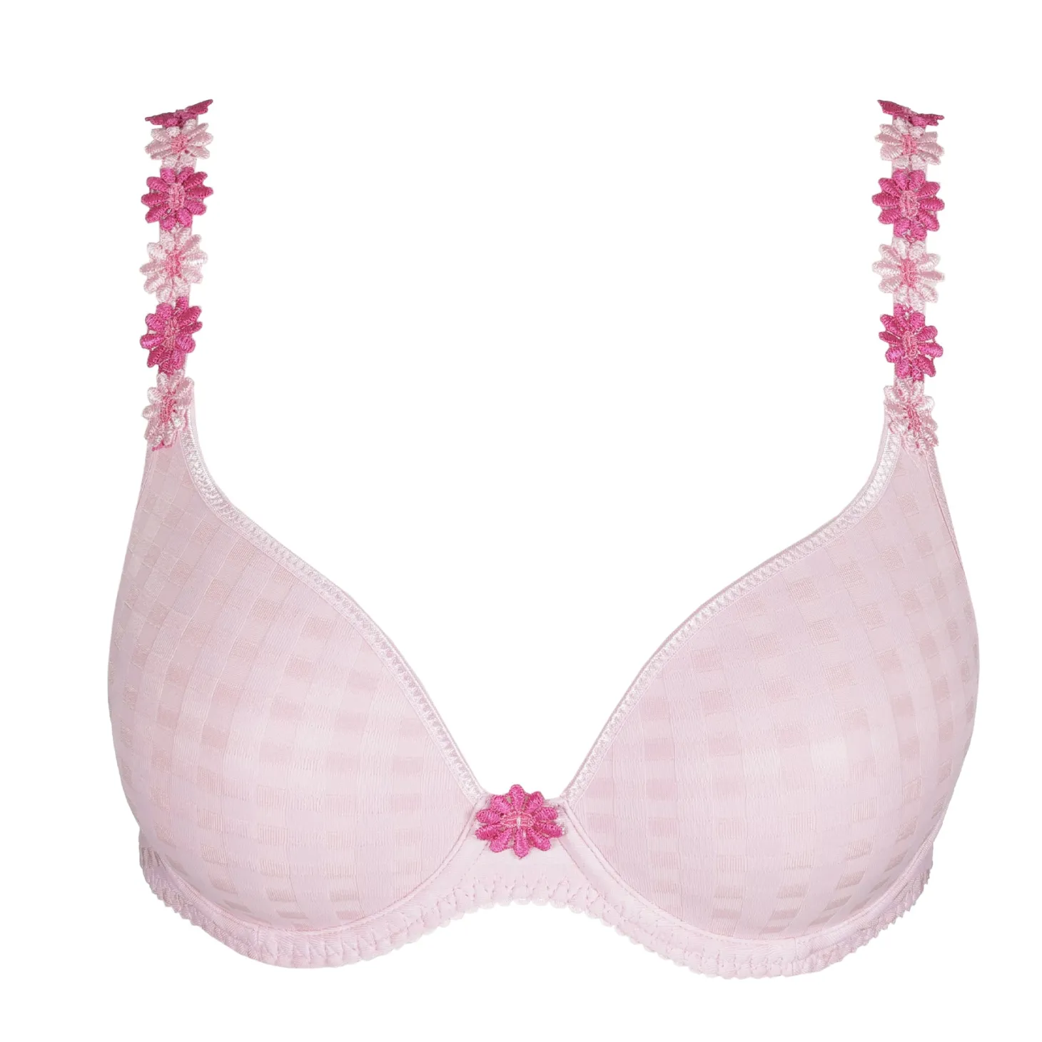 - Design: Molded cup balcony/heart shape bra with lightly padded cups. The bra lifts and centers the breasts while giving a seamless look perfect for t-shirts. Embroidered daisy straps. Naturally round shape with a deeper plunge for lower cut tops and dresses.