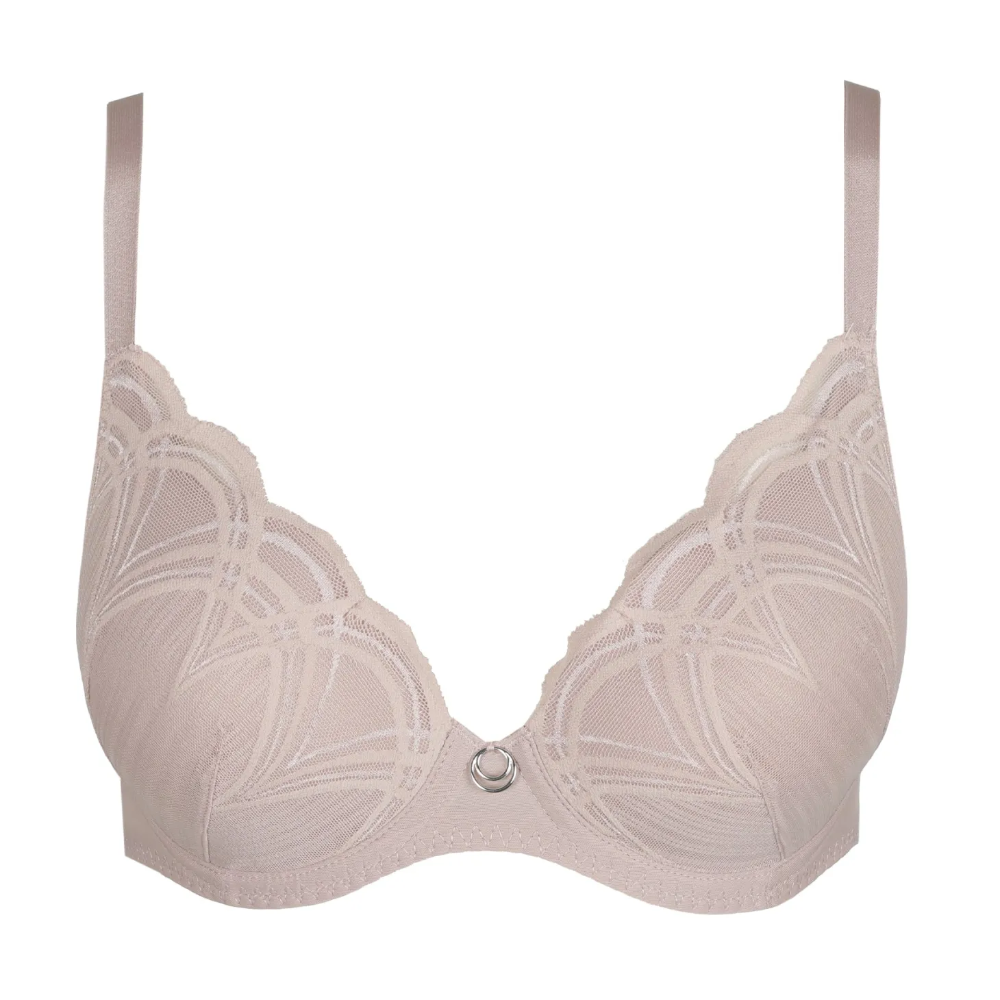 - Design: Featuring smooth moulded cups with sheer tulle overlay and architectural embroidery, this underwire bra offers a flattering shape with scalloped lace accents and a sleek silver-tone charm at the centre.