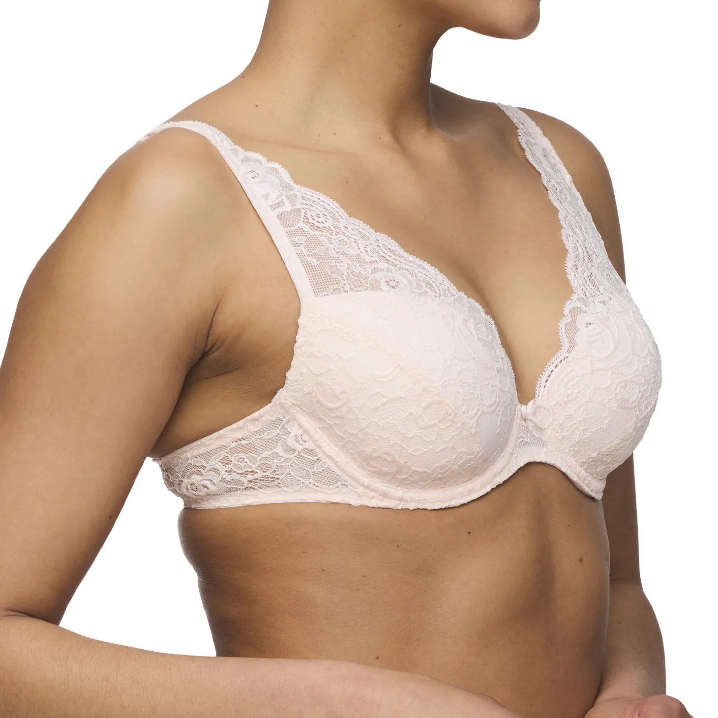 - Design: This deep plunge bra in soft blush features all-over rose-pattern lace, scalloped edging, and underwire support – perfect for low-cut necklines with a touch of elegance.
