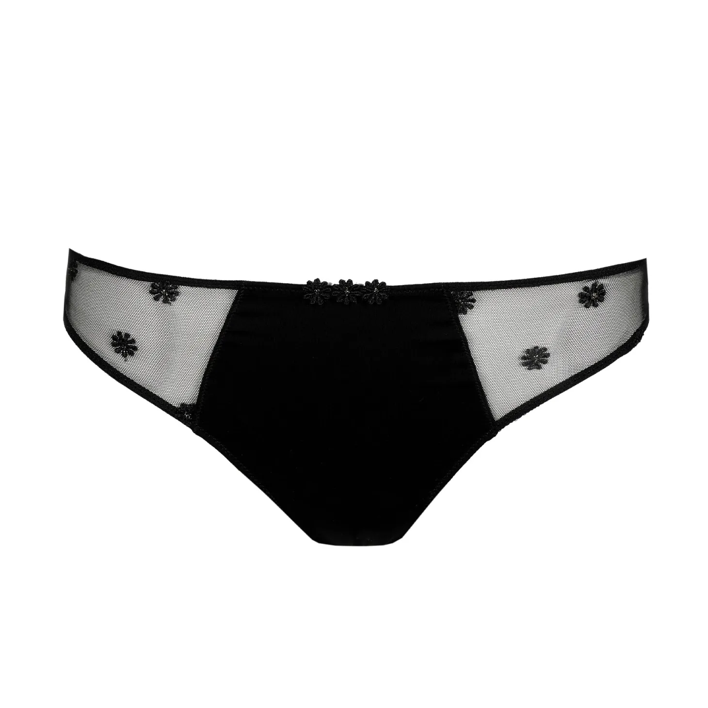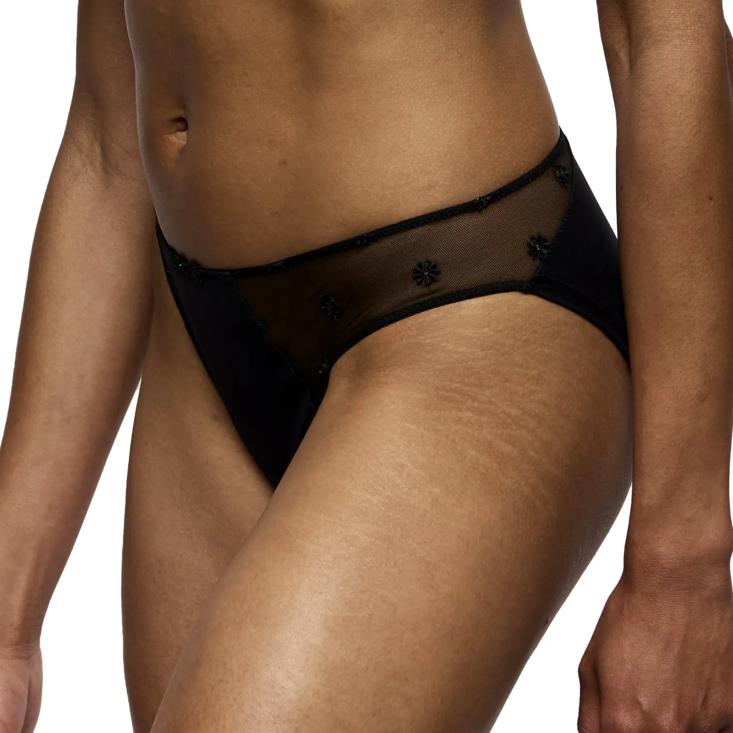 - Design: This mid-rise brief features a soft, opaque front balanced with delicate mesh side panels adorned with subtle floral embroidery, finished with a refined cut and clean edges for everyday wear.