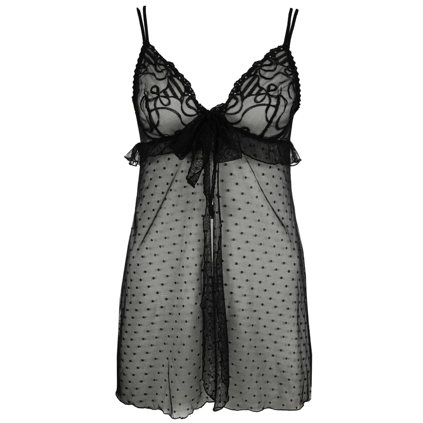 - Design: This babydoll is designed with sheer dotted mesh, delicately embroidered cups, and a soft tie-front detail that creates a light, flowing silhouette.