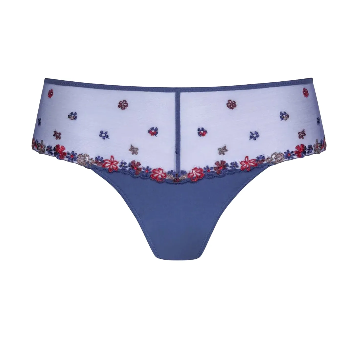 - Design: These blue bikini briefs feature a sheer mesh waistband delicately embroidered with scattered floral motifs in red, blue, and lilac tones. A floral lace trim runs along the leg openings, while the back is crafted from smooth, seamless fabric for a flattering fit.