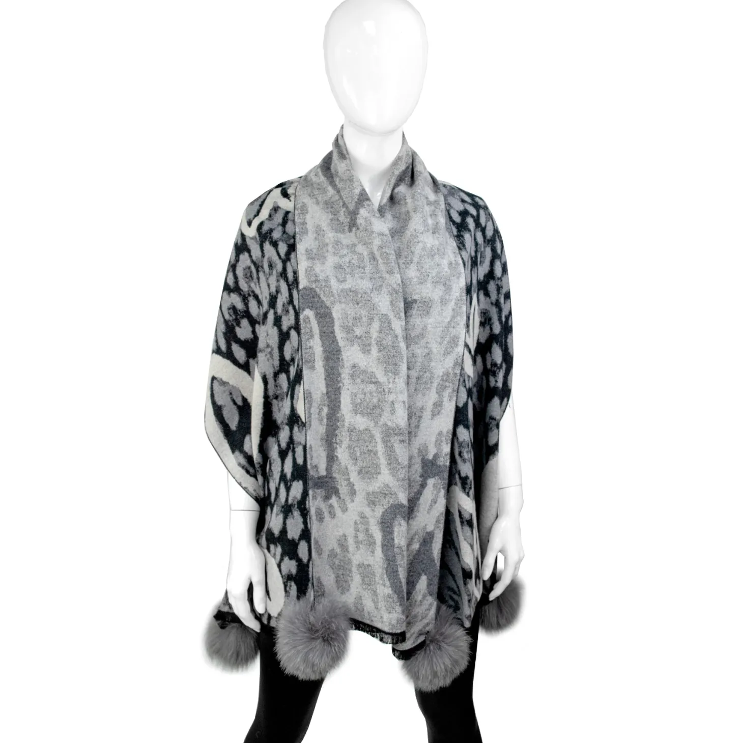 - Design: This charcoal-toned poncho features a contemporary abstract-animal jacquard pattern in layered shades of grey and black.