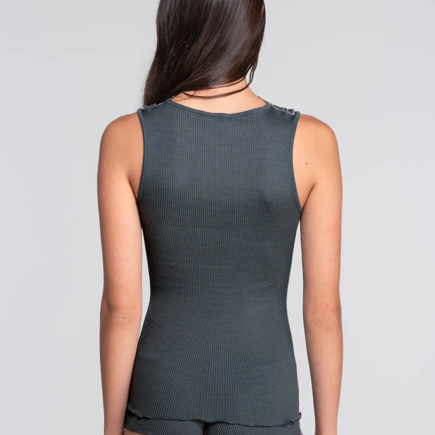 Crafted in Italy from Oscalito’s signature woolen-silk rib knit, this exquisite tank top blends everyday comfort with couture-level detail. The neckline features an intricate embroidered tulle insert that adds a touch of luxury to its timeless silhouette. Soft, breathable, and naturally stretchy, it fits close to the body for a flattering finish that layers beautifully or stands elegantly on its own.
