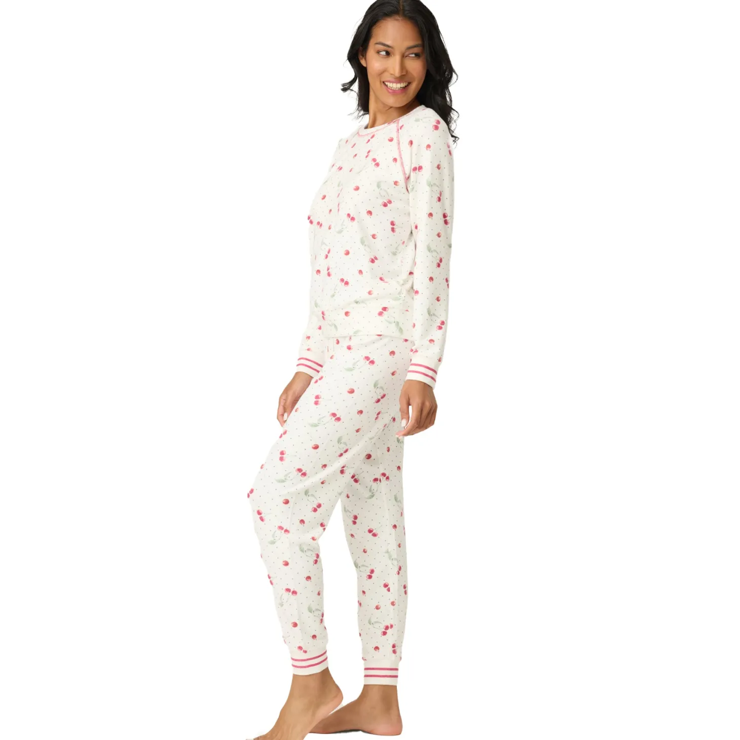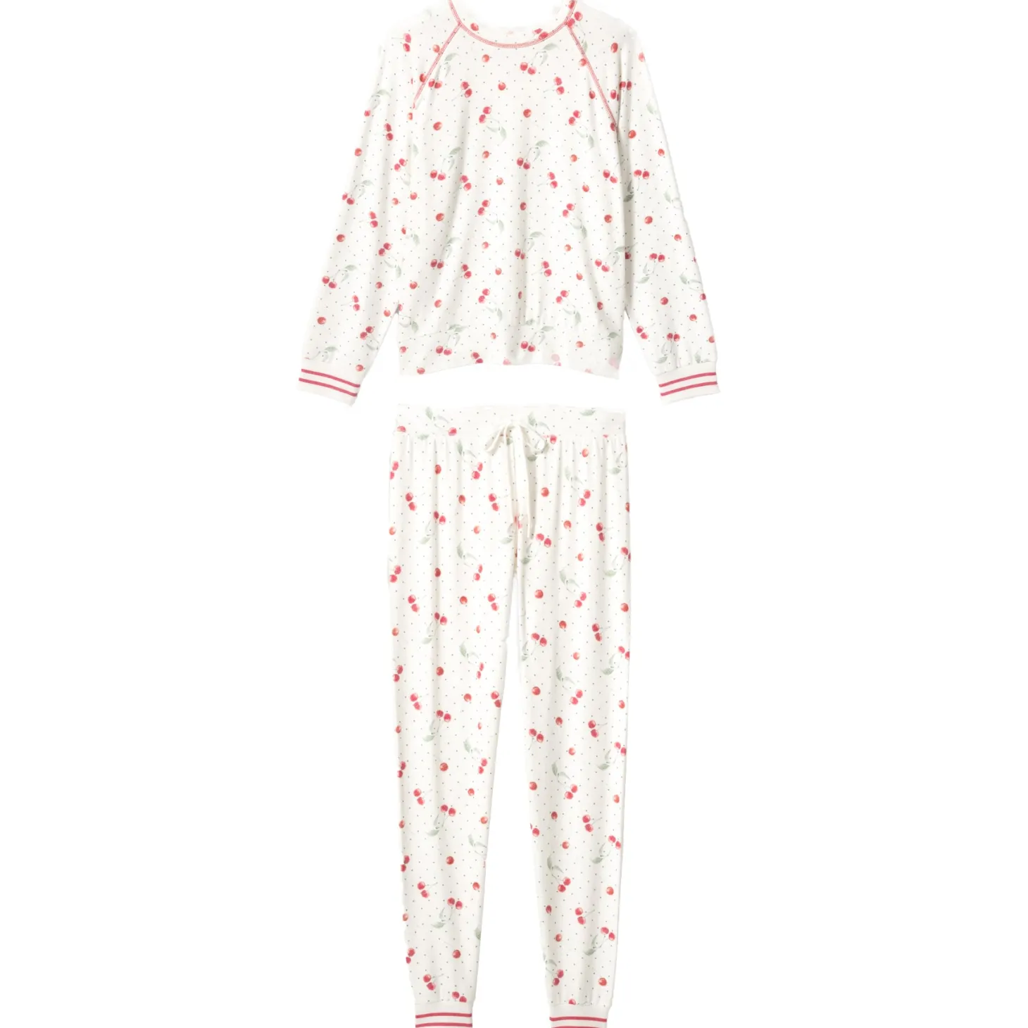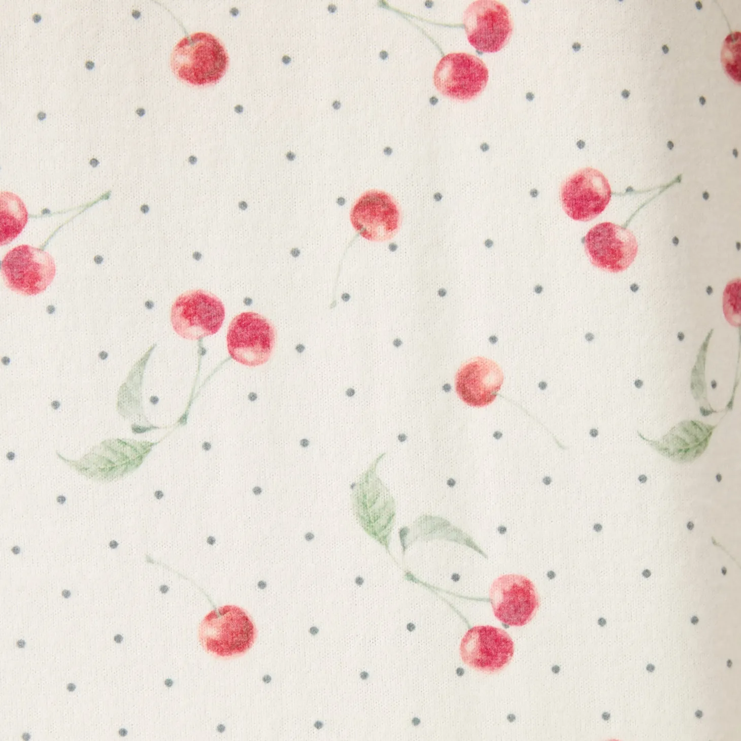 - Design: This two-piece pyjama set features a soft ivory base sprinkled with a delicate cherry and dot print for a playful yet refined look.
