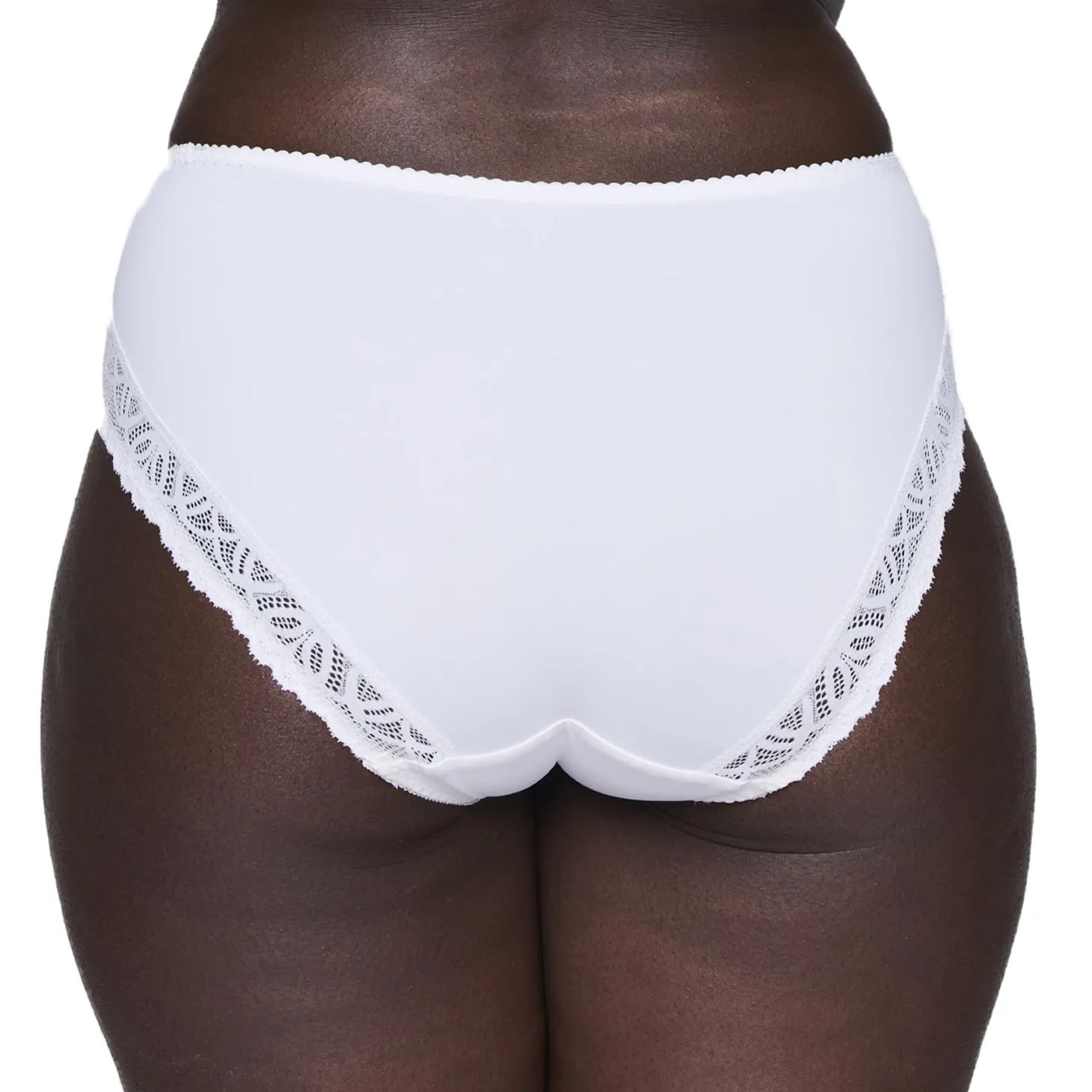 - Design: This full brief features a smooth, high-rise silhouette in crisp white, accented with delicate lace insets along the hips and back legs for a feminine finish that’s both flattering and stylish.