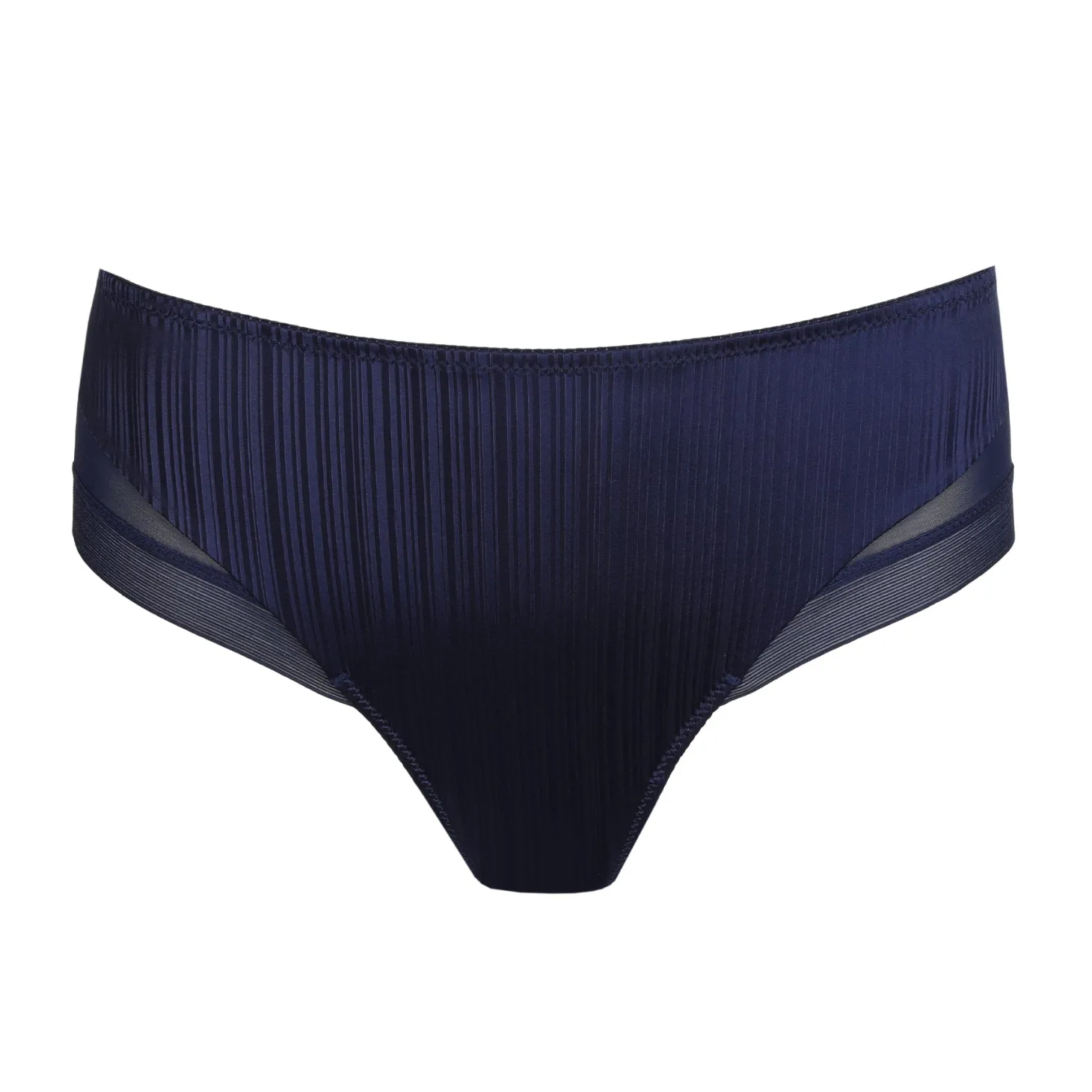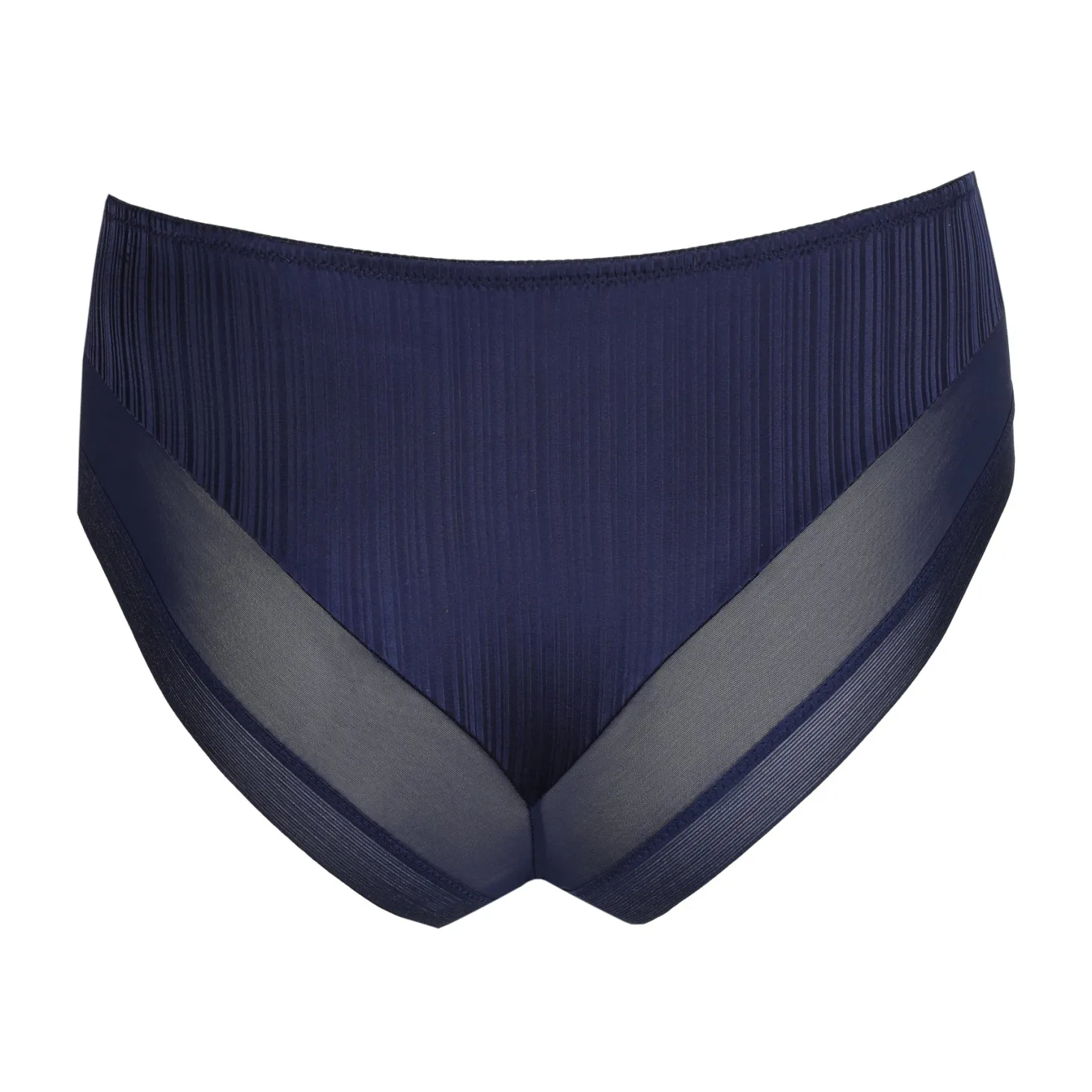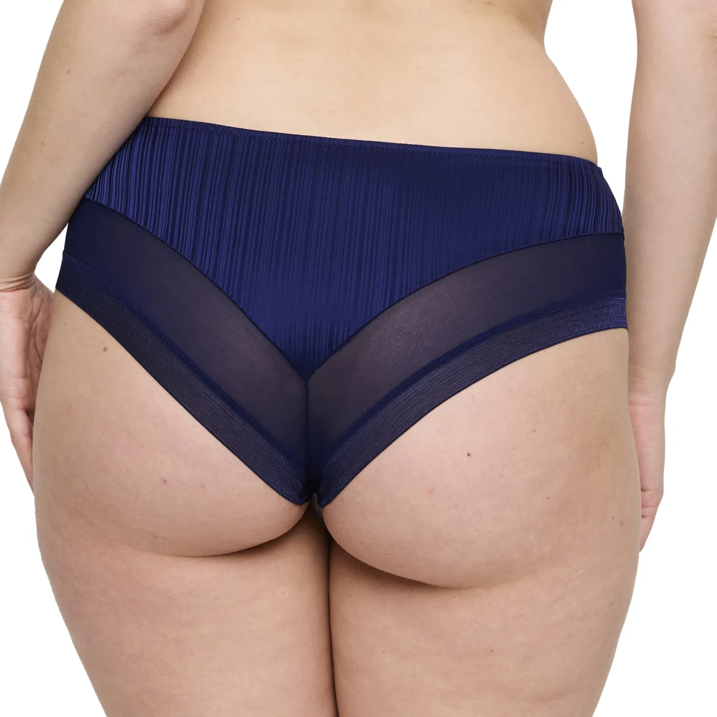 - Design: These sapphire blue panties feature a pleated satin finish with sheer mesh panels at the sides and back for a modern, elegant touch.
