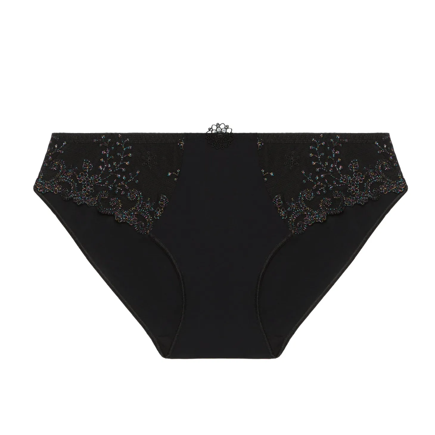 - Design: Mid-rise. The panty is made of Austrian embroidery lace on stretch tulle with guipure. A small delicate embroidered applique flower is affixed to the front to create a feminine finish.