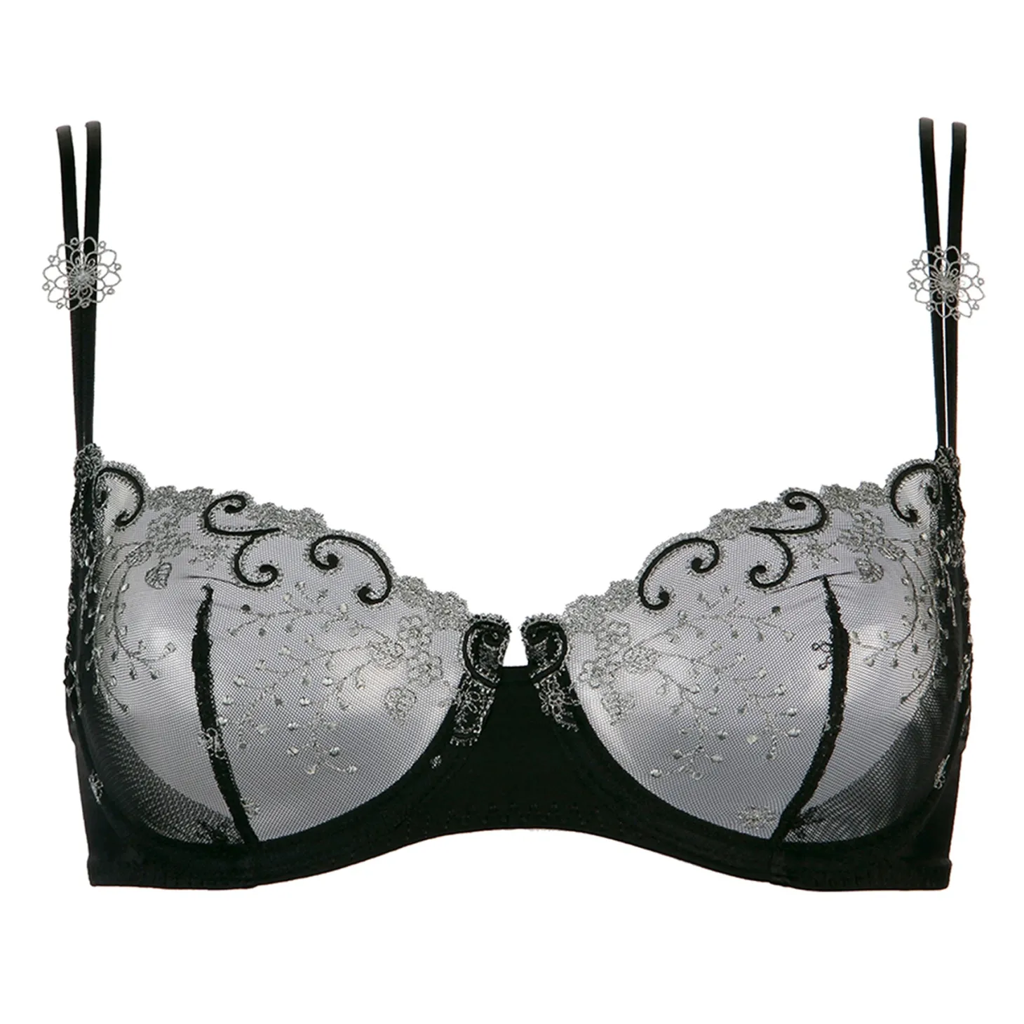 - Design: The cup is made of Austrian embroidery lace on stretch tulle with some guipure and Swarovski crystals. Small delicate embroidered applique flowers are affixed to the straps to create a feminine and luxurious finish.