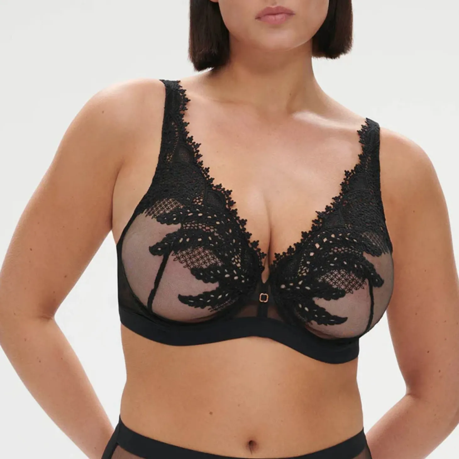 - Design: Guipure embroidered underwire triangle bra. Ultra plunging neckline decorated with scalloped embroidery. Sheer cups in guipure embroidery with vertical seam for a round shape. Thin center front in sheer tulle with a gold hardware accent. Crepe under bust band . Straight back band in tulle, lined from D cup for extra support. Straps are decorated with guipure on the front. Adjustable straps with gold hardware on the back.