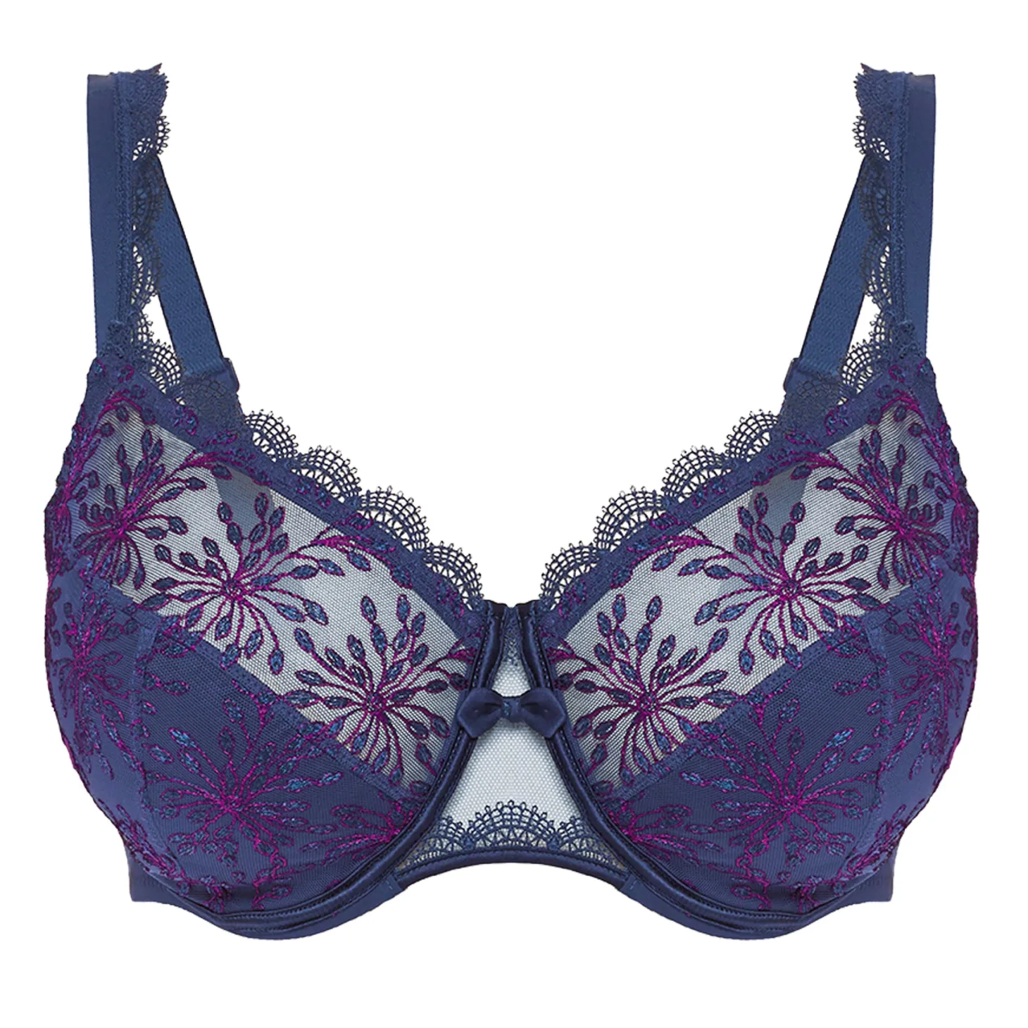 - Design: Full coverage embroidered and tulle bra with underwire. The 3-part cup design provides superior support and a flattering, round shape. All lace cups are lined with cotton on the lower cups for comfort and support. The Center front with tulle detail is accentuated with satin finishes and features a decorative bow detail. Multi-position, adjustable straps: classic or criss-crossed. U-shaped ballet back assures superior comfort, fit, and support. Oeko-Tex® certified materials.