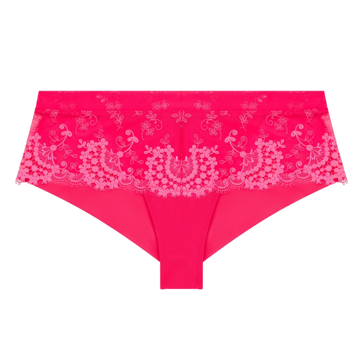 - Design: Low-rise shorty. Floral embroidery on sheer tulle in front. Also on the front is a second layer of tulle in a triangle shape for additional coverage. Folded waistband made of stretch Italian satin Jacquard for a comfortable and seamless fit. Cotton gusset on panty.