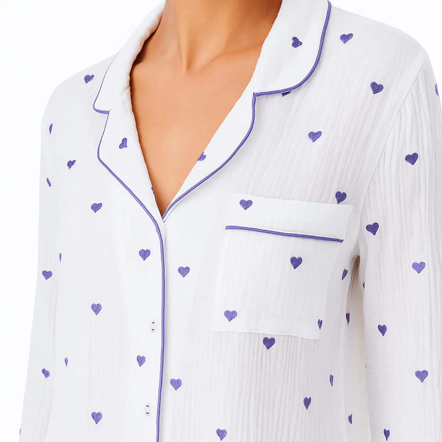 - Design: Classic 2-piece pyjama set. Notch collar button down top with chest pocket. Pull-on pant. Allover embroidered hearts print with contrast piping trim.