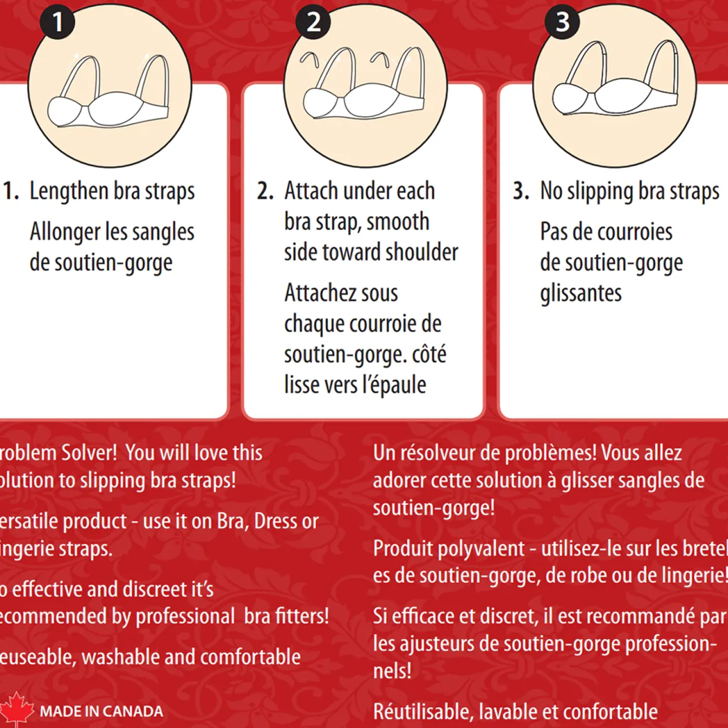 - This tiny strip attaches underneath any strap to stop slipping, sliding and falling straps. Designed to be comfortable, reusable, and easy to apply. Invented by a woman, and recommended by professional bra fitters. Made in Canada.