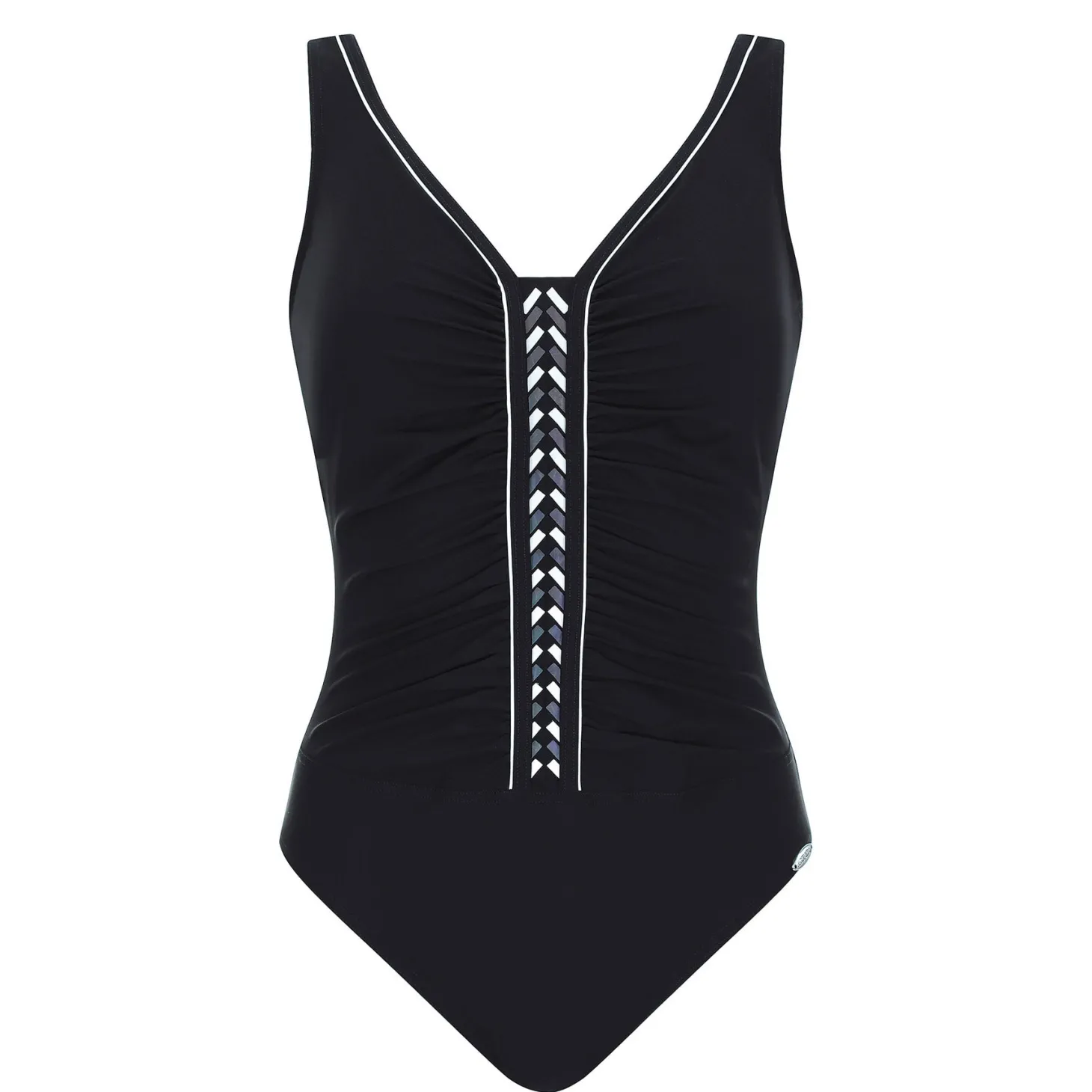 - Design: A chic one-piece swimsuit featuring lightly padded, wireless cups with contoured foam for a naturally smooth shape. An inner support band provides gentle structure beneath the bust, while front ruching with a double-layered panel flatters the waistline and offers subtle tummy control. Finished with elegant decorative accents, adjustable shoulder straps, and a gracefully scooped back. Crafted from premium LYCRA® with XTRA LIFE™ fibres, this swimsuit delivers exceptional durability—resisting chlorine, seawater, and sunscreen up to ten times longer than standard fabrics.