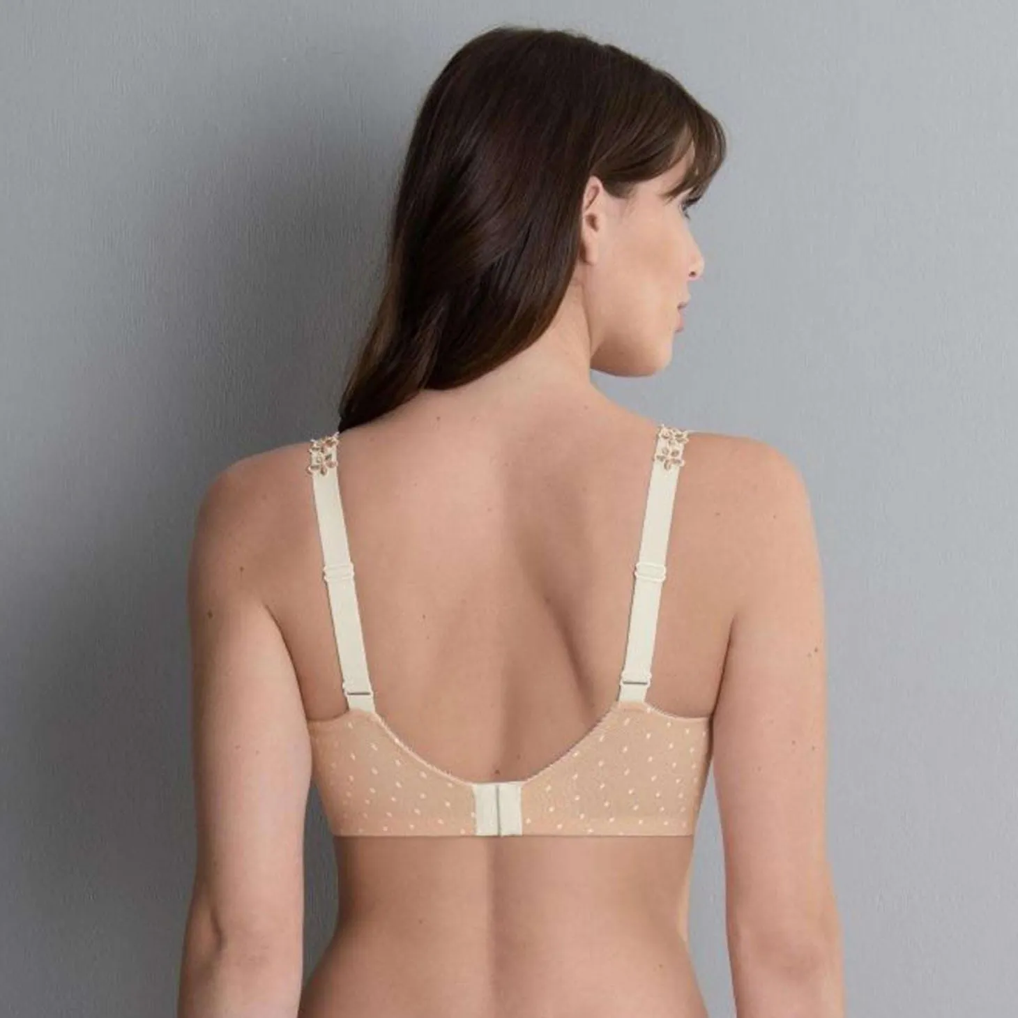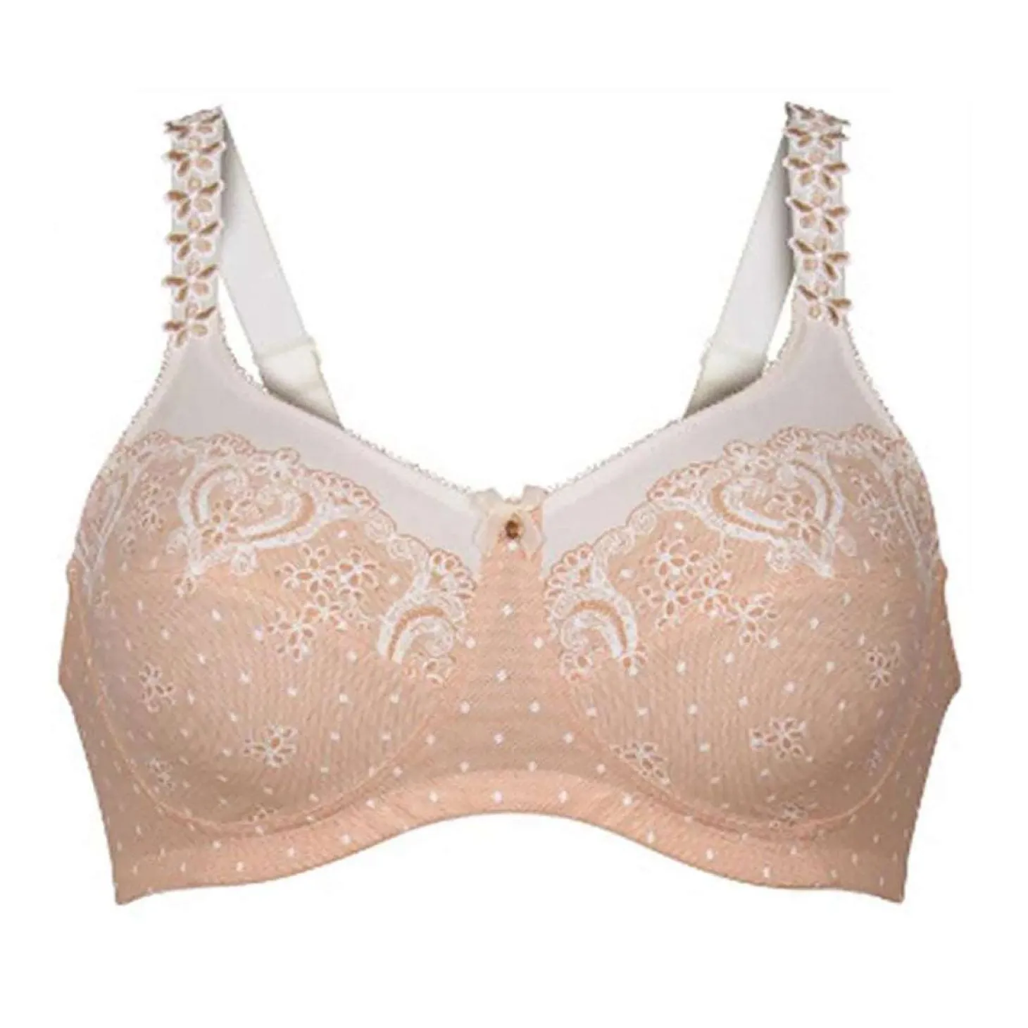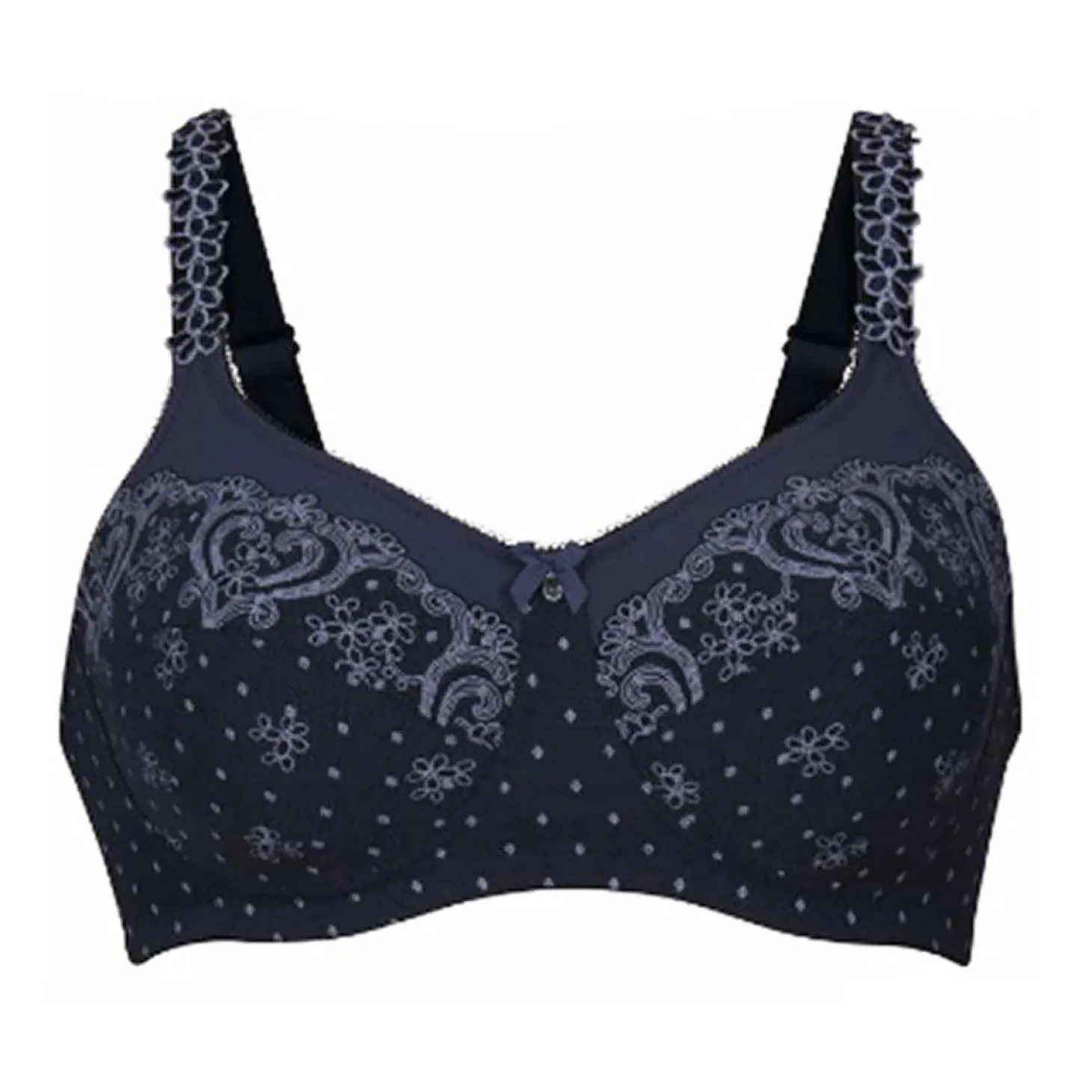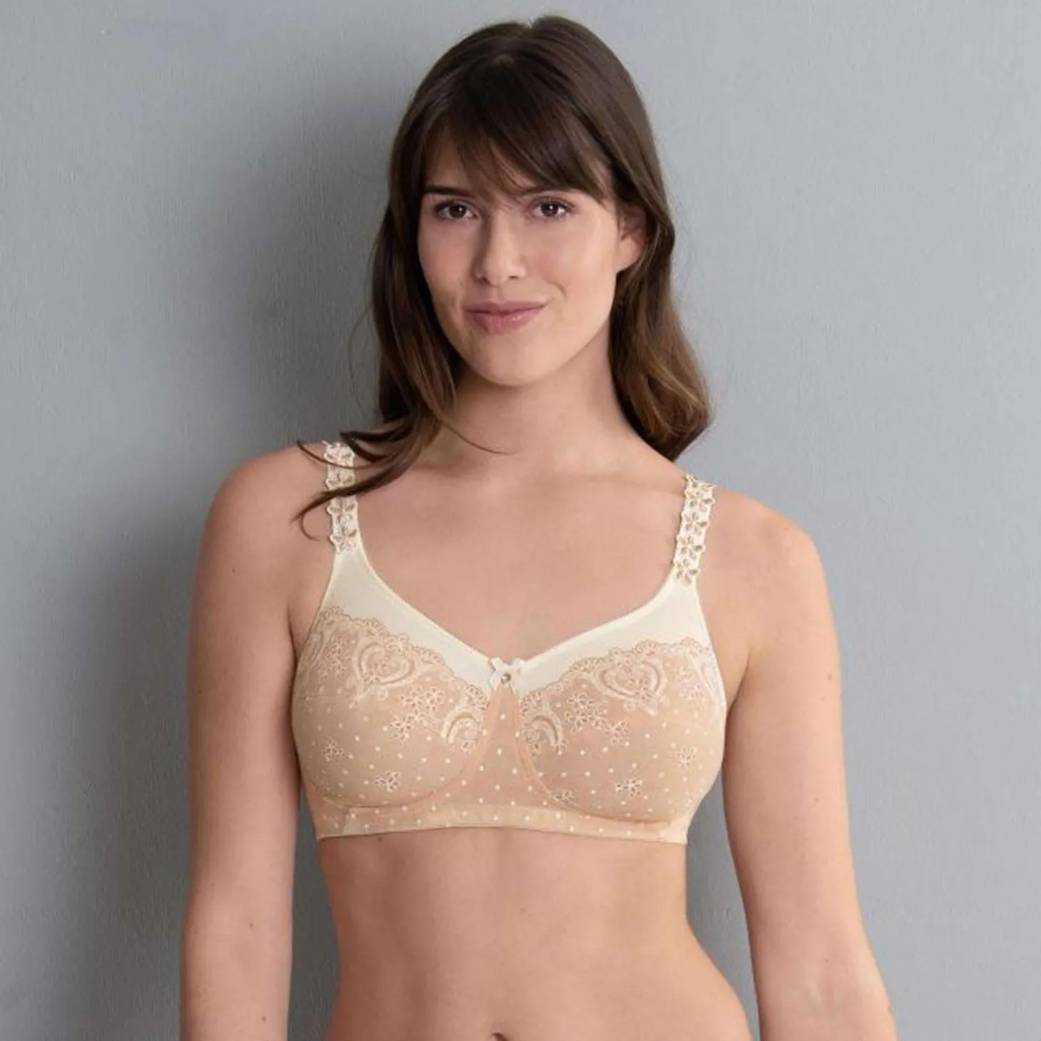- Design: The ornamental design of the print along the border of the upper cup area is a real eye-catcher and culminates in a uni-coloured, figure-flattering panel around the cleavage. The firm lining of the stitched cups holds the prostheses securely in place. The charming look is rounded off by little embroidered flowers in two colours all along with the straps.