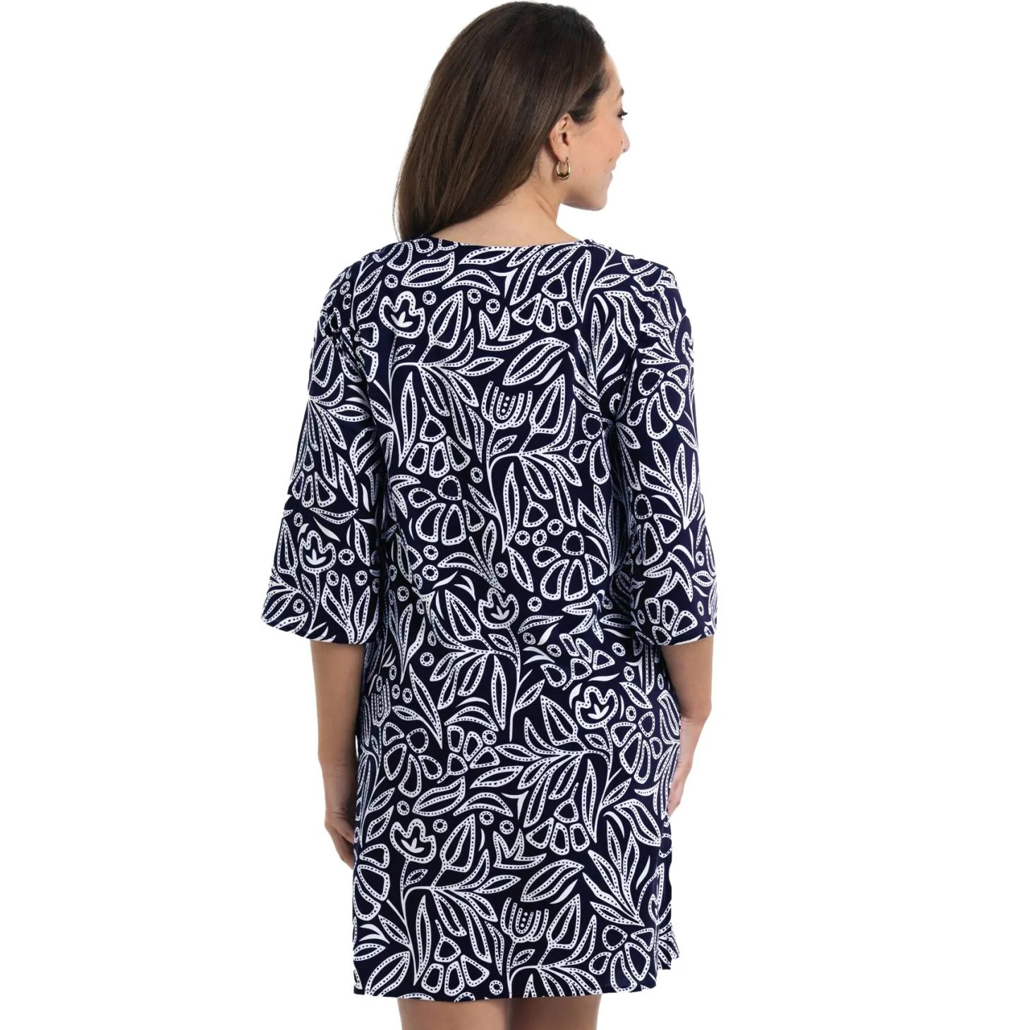 - Design: This dress features a bold navy-and-white abstract floral print with a relaxed silhouette, three-quarter sleeves, and a subtle keyhole neckline for added interest.