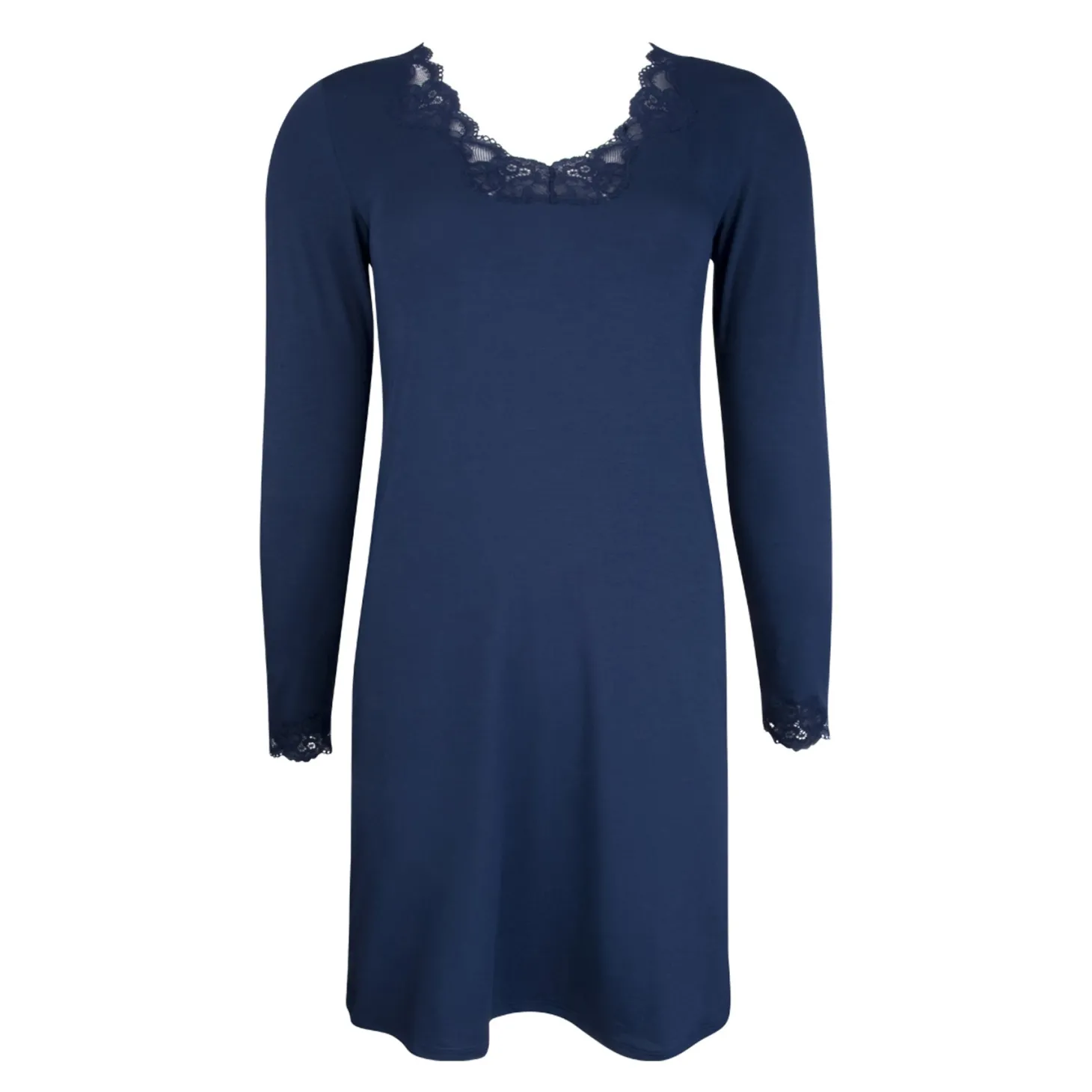 - Design: Soft and stretchy fabric for all-night comfort. Square/V-neckline with floral lace trim. Long sleeves with lace-detailed cuffs. Deep navy blue colour (Bleu Marine). Designed for a flattering yet relaxed fit.