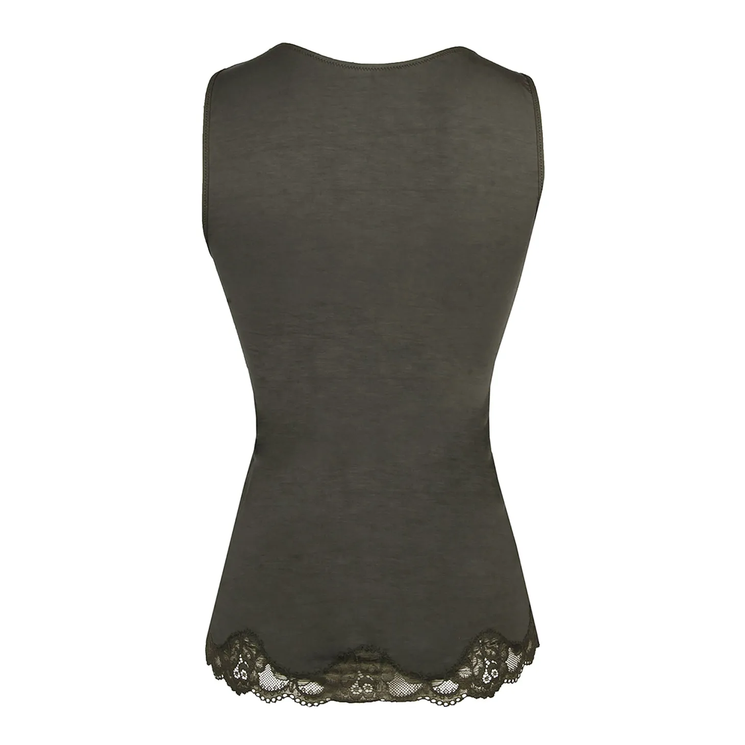 Sleek, soft, and effortlessly refined – the Antigel Simply Perfect V-Neck Tank in Éclat Aventure is a layering essential with feminine flair. Crafted from ultra-soft stretch fabric, it features delicate floral lace trim along the neckline and hem for an elegant finish. The fitted silhouette hugs your shape, making it perfect for wearing alone or under your favourite knits and jackets. A chic staple in deep olive green for every season.