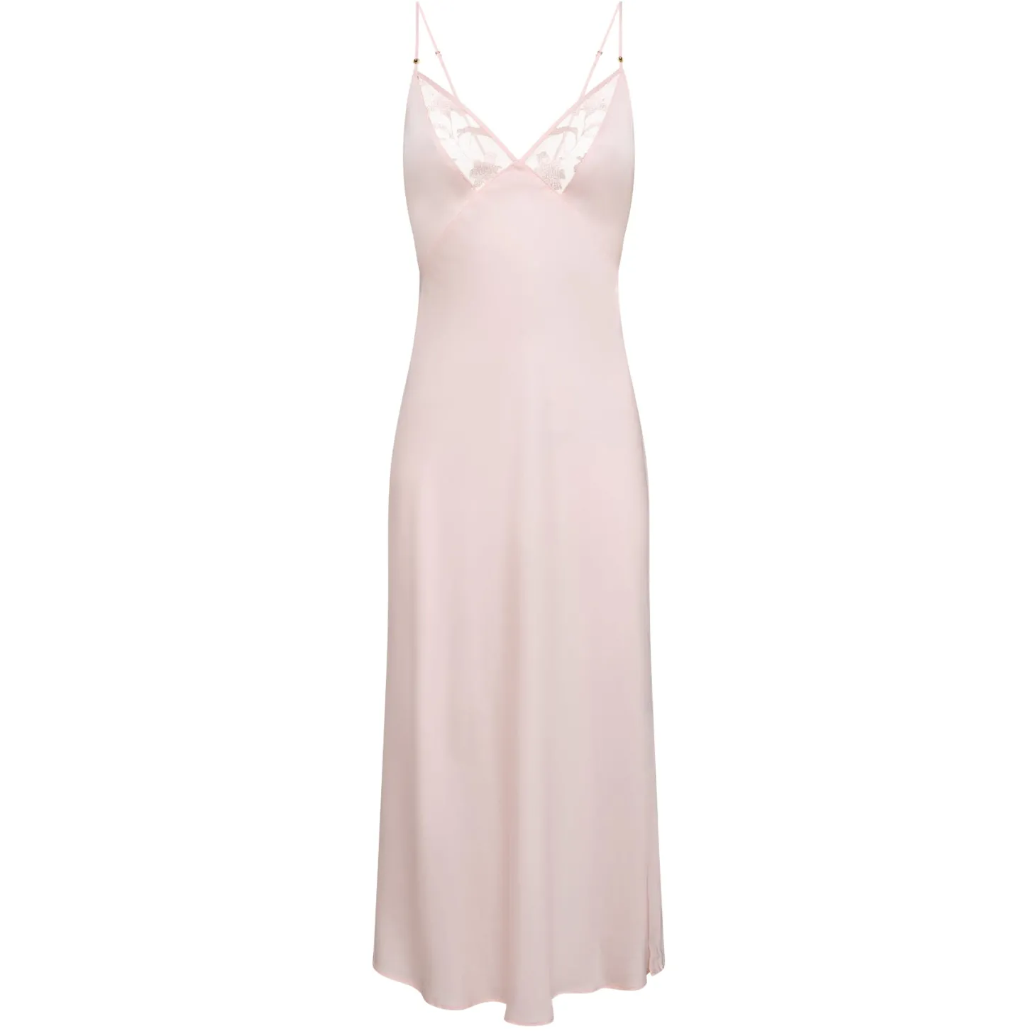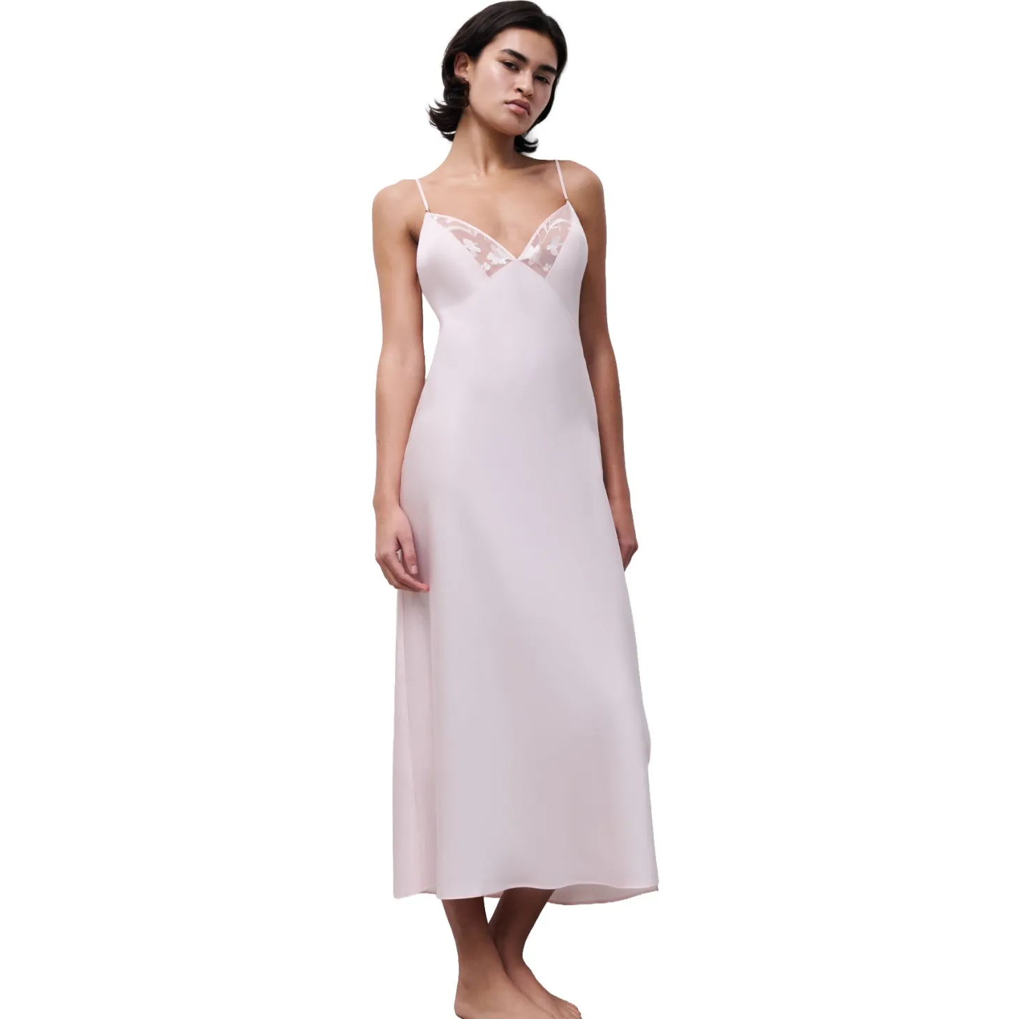 - Design: Long nightgown. Simple, fixed straps, adjustable at the back. V-neck.