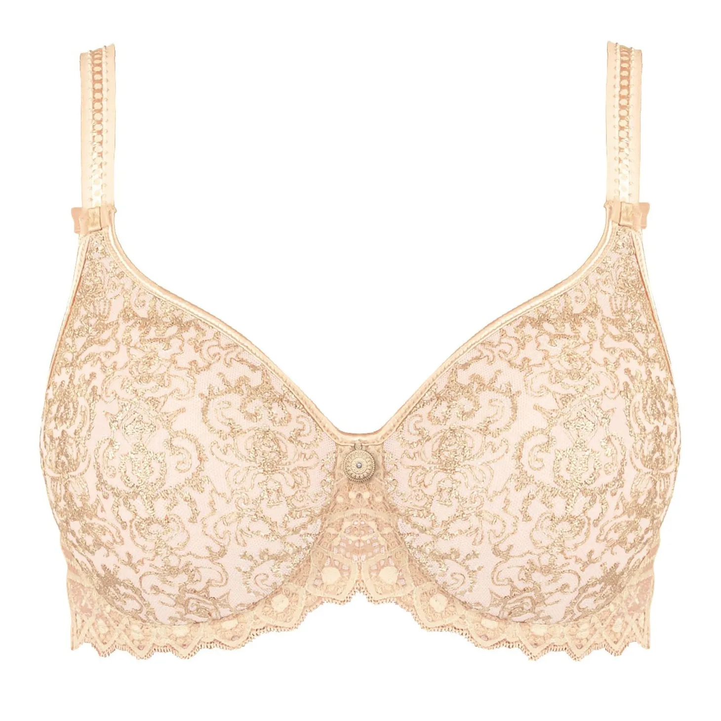 Taking years to develop and perfect, the Cassiopee provides stunning, round support all while boasting seamlessness and invisibility. Delicate mesh borrows its strength from intricate embroidery and satin trimmings. Micro sheer bows and detailed stitching on Cassiopee’s wide straps are beautiful details to this delicate and truly elegant bra.