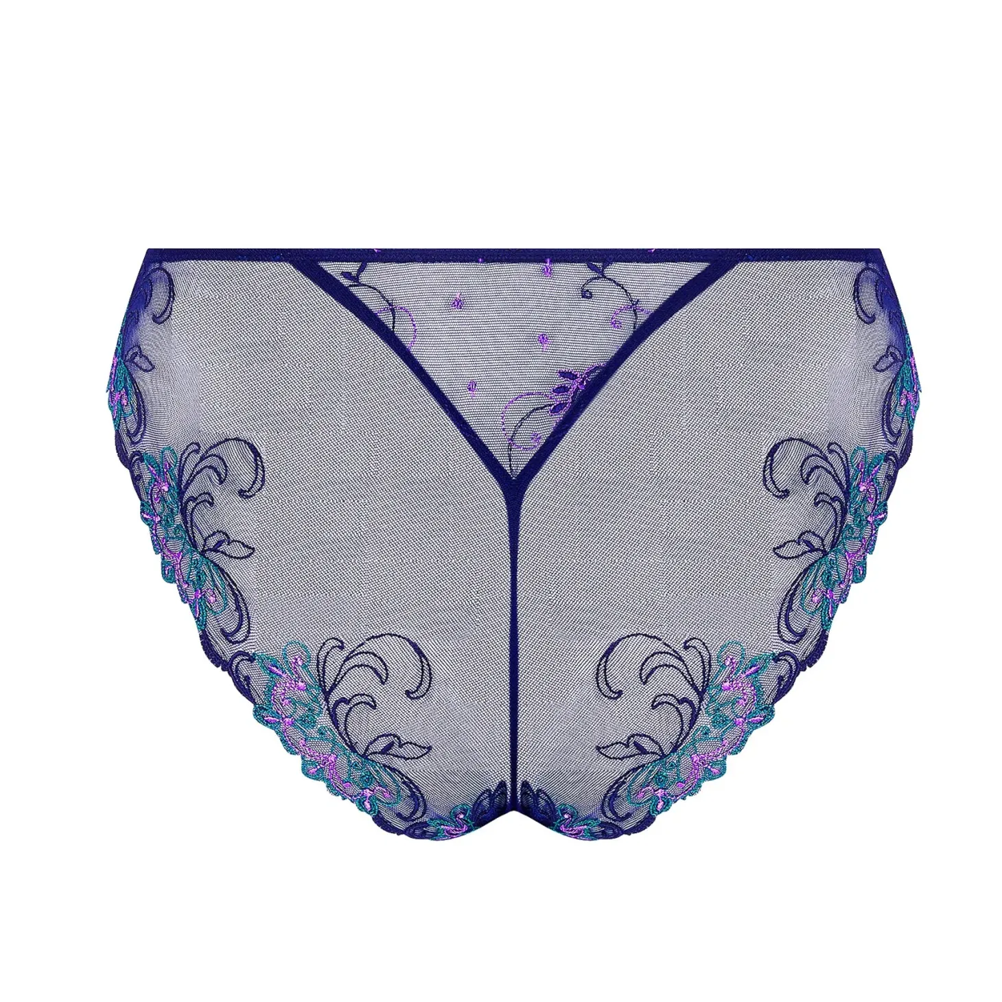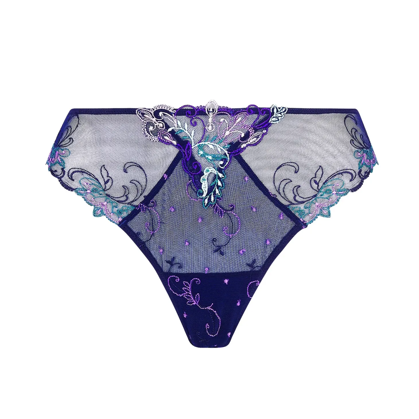 Step into luxury with the Déesse Désirs Italian Panty, a captivating blend of sensuality and sophistication. Crafted in deep midnight blue mesh, this thong features intricate violet and teal embroidery, creating an ethereal floral design that graces the front. The delicate detailing adds a touch of elegance, while the barely-there sheer panels offer a tantalizing allure. Perfect for those who crave both beauty and comfort, this piece is ideal for a special occasion or as an everyday indulgence.