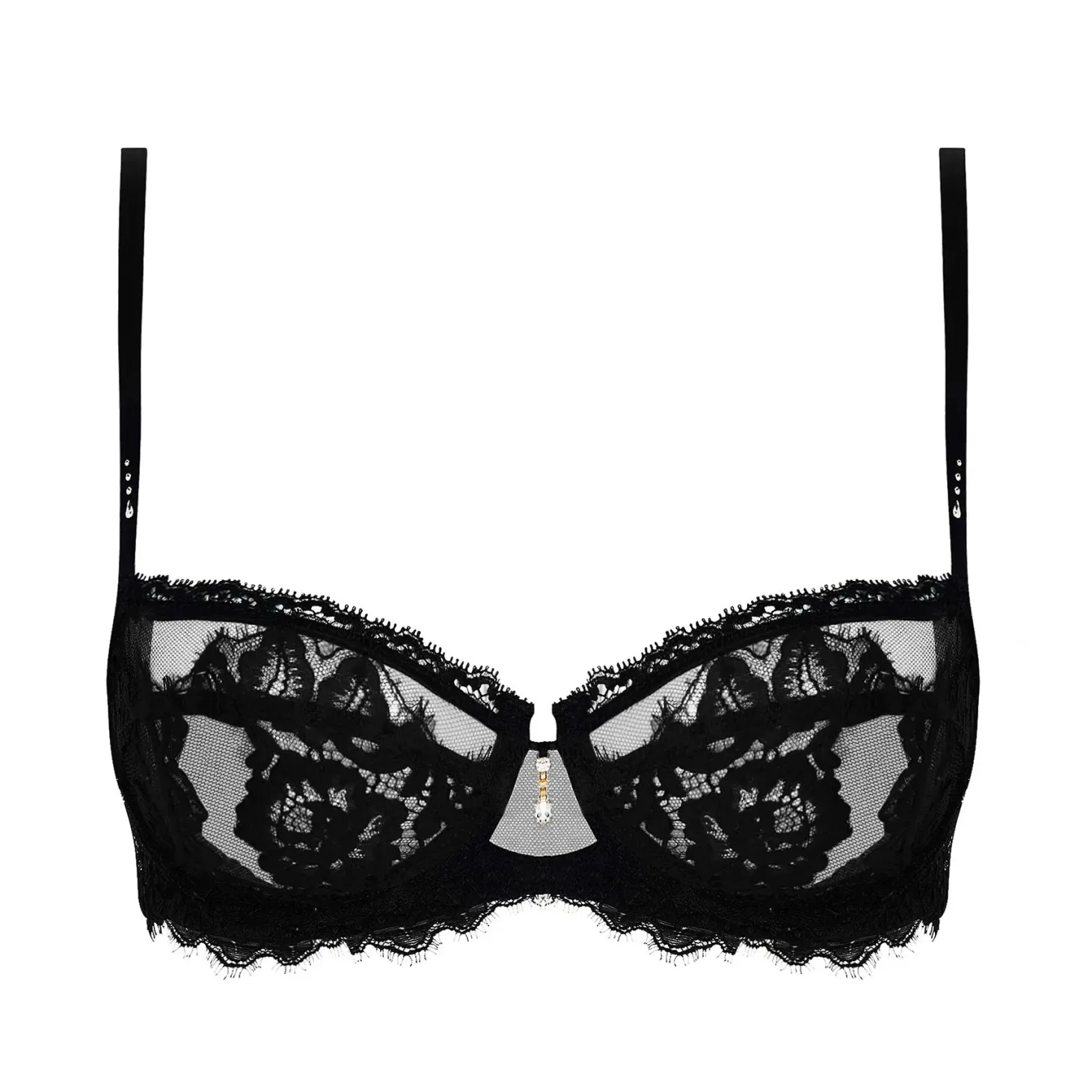 - Design: A black lace bra featuring delicate floral patterns and a center jewel accent for a refined and luxurious finish.