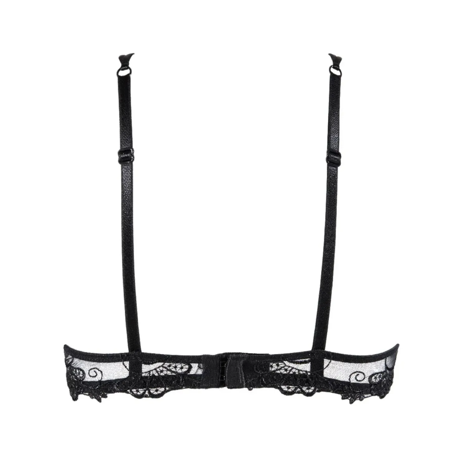 - Design: Underwired demi-cup bra with horizontal cut-out. This bra offers a rounded shape, and feminine cleavage. Slim, adjustable spaghetti straps add femininity and lightness. Tattoo-effect guipure lace inserts on cups and back. Delicate Swarovski pendant at cleavage.
