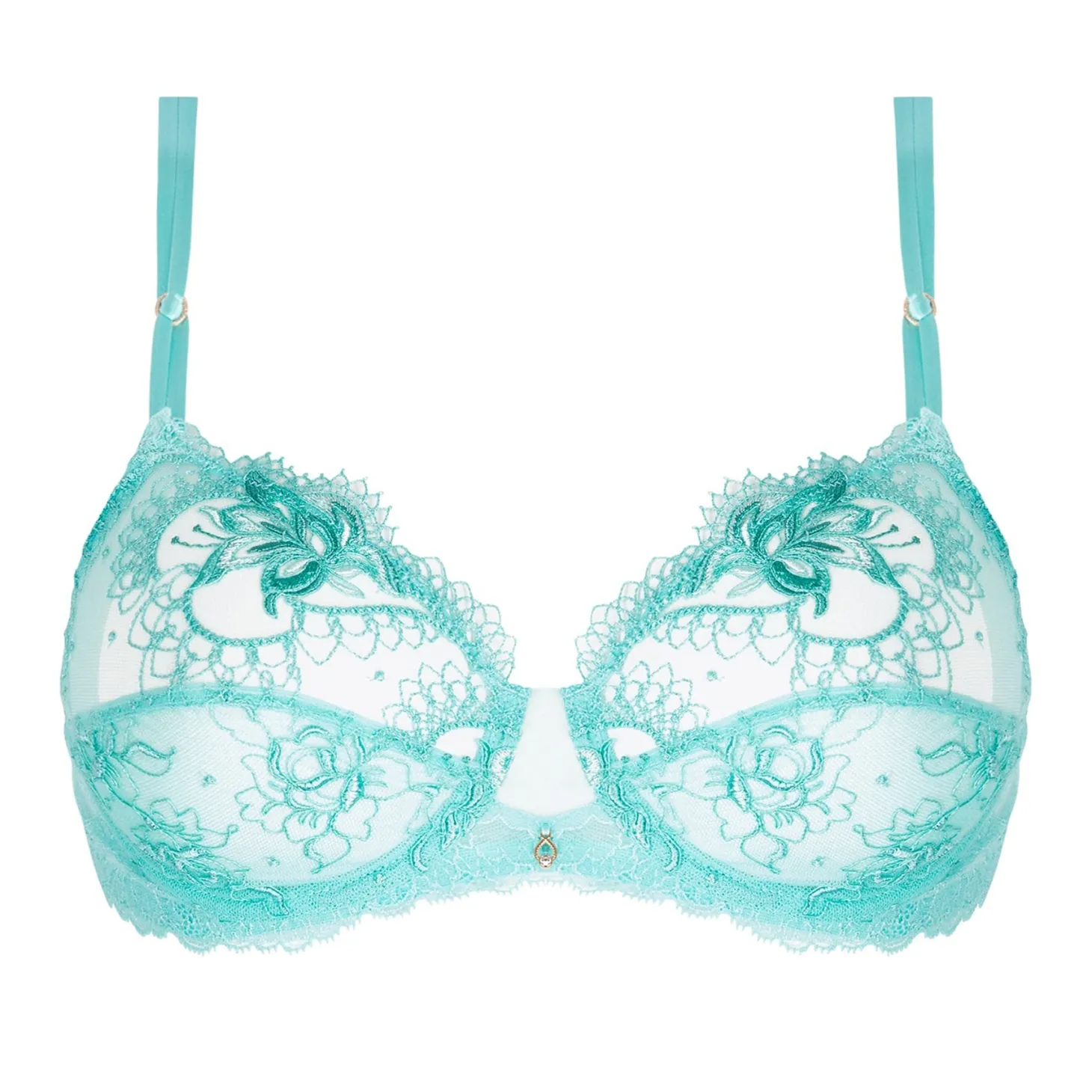 - Design: Sheer embroidered tulle full cup underwired bra adorned with scalloped multi-threaded embroidery and guipure lace. Front accentuated by a jeweled golden rhinestone. Adjustable straps.