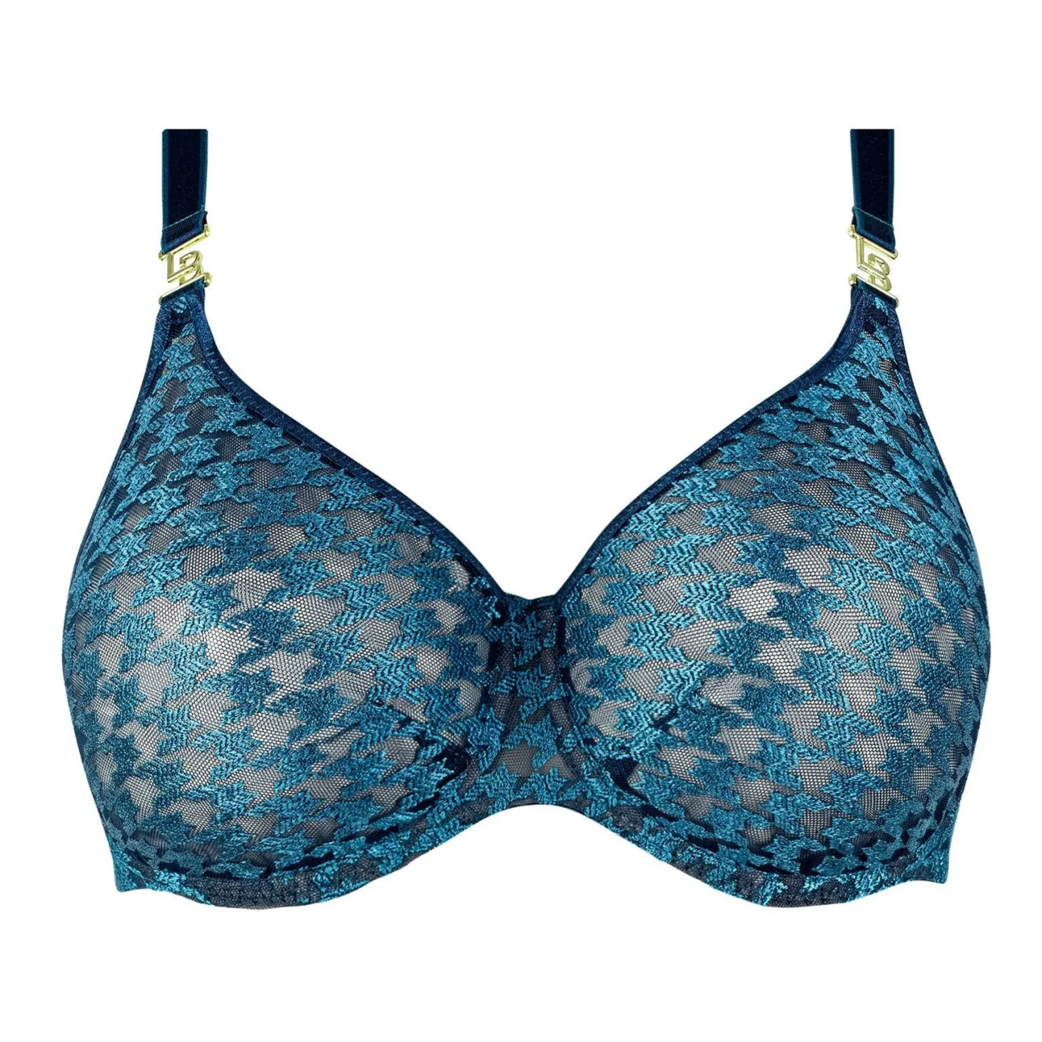 - Design: This bra features a striking houndstooth lace pattern in shimmering teal over sheer navy mesh, finished with gold hardware accents on the straps for a refined touch.