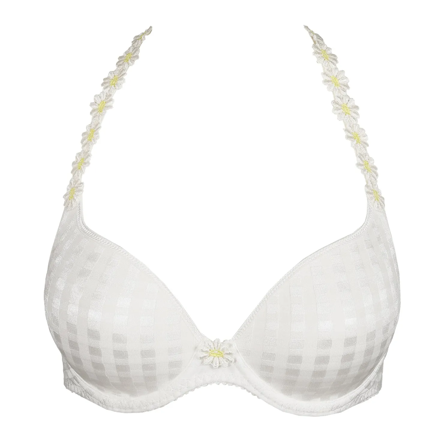 - Design: Molded cup balcony/heart shape bra with lightly padded cups. The bra lifts and centers the breasts while giving a seamless look perfect for t-shirts. Embroidered daisy straps. Naturally round shape with a deeper plunge for lower cut tops and dresses.