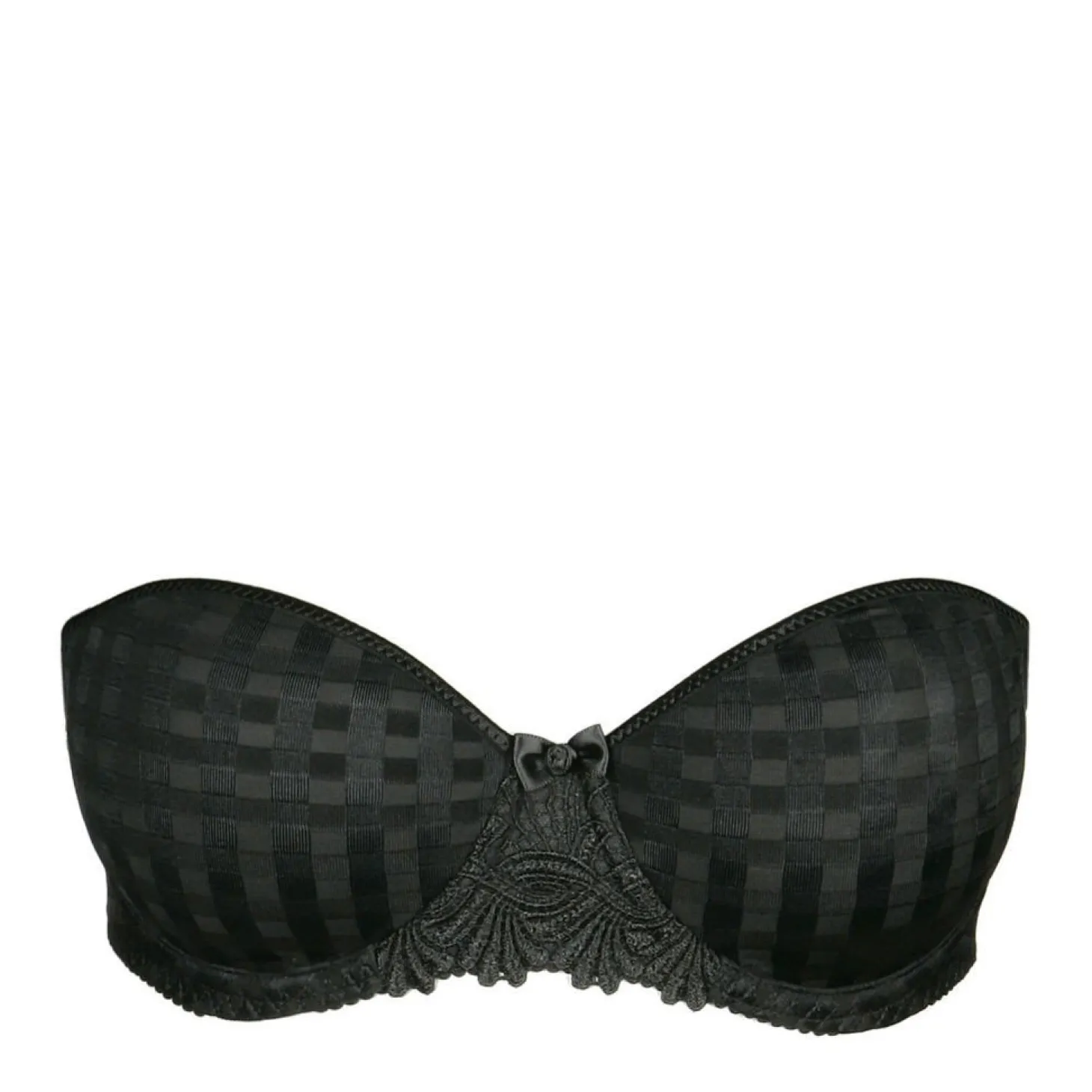 Strapless bra with a more horizontally cut cup. The straight back has a silicone band that provides extra support if the bra is worn as a strapless bra.