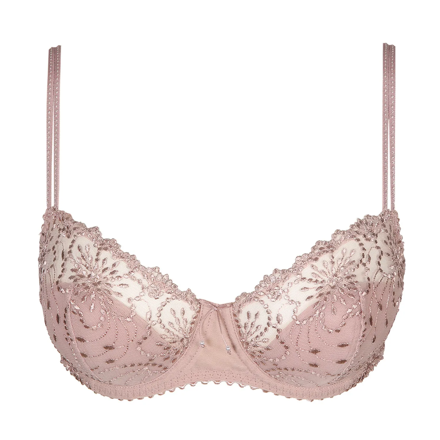 Fit with a capital F? Elegant embroidery and a chic look? This balcony bra has it all! The skinny straps complete the look. This beautiful balconette centers the breasts and provides ample cleavage due to the half-padded cups. Bois De Rose gives the delicate lace of Marie Jo Jane that extra touch of elegance that every woman craves.