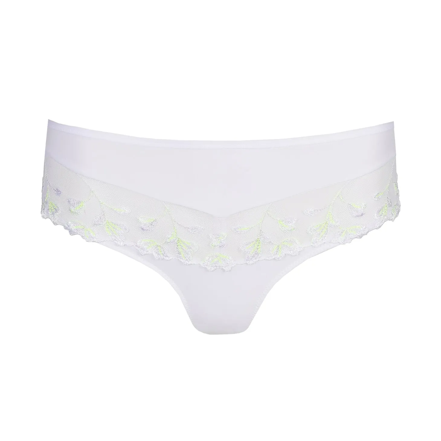 Sexy hotpants with embroidery at the hips; airy tulle at the waist, and a comfy opaque fabric at the back. Summery White looks fabulous with trendy, colourful accents like neon yellow or fresh lilac.