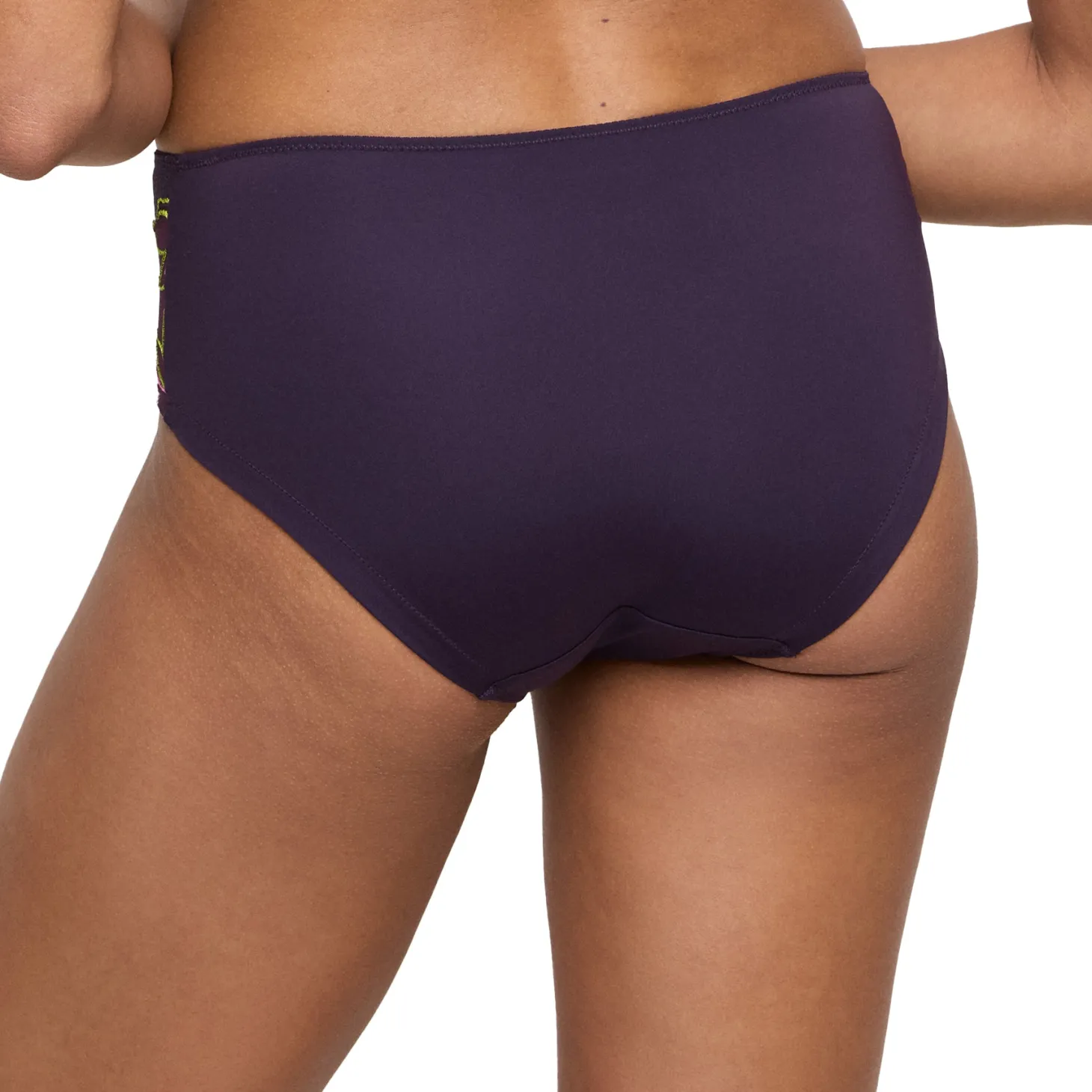 - Design: This high-waisted brief in deep plum combines a smoothing opaque centre panel with sheer mesh sides, delicately embroidered with vibrant floral motifs for a striking yet feminine finish.