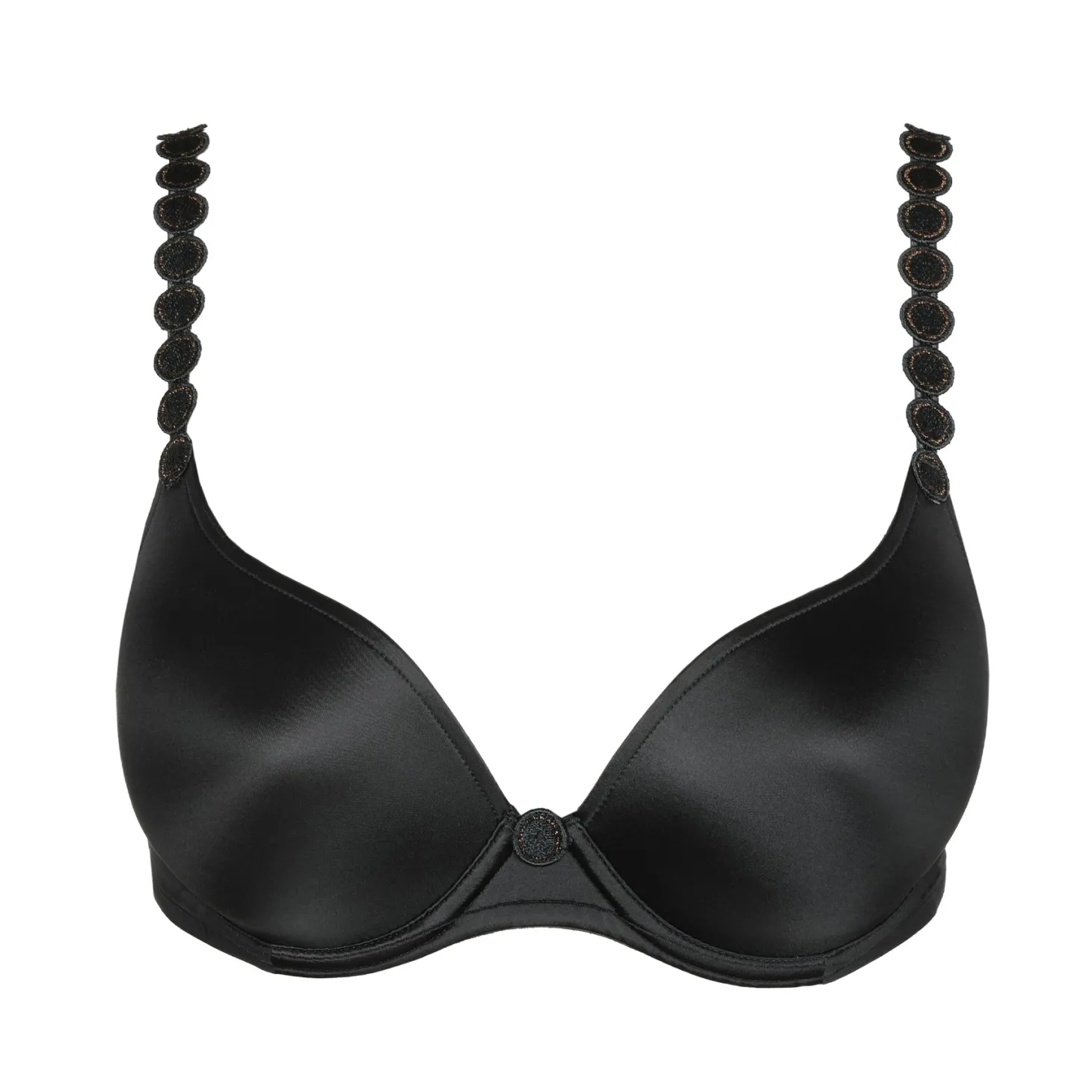 A padded bra with heart-shaped cups. The cups offer excellent coverage at the top. The bra is cut high on the upper cups and then plunges into a deep neckline between the breasts. The sheer tulle on the back is cut straight. The straps can be worn over the shoulders or around the neck.